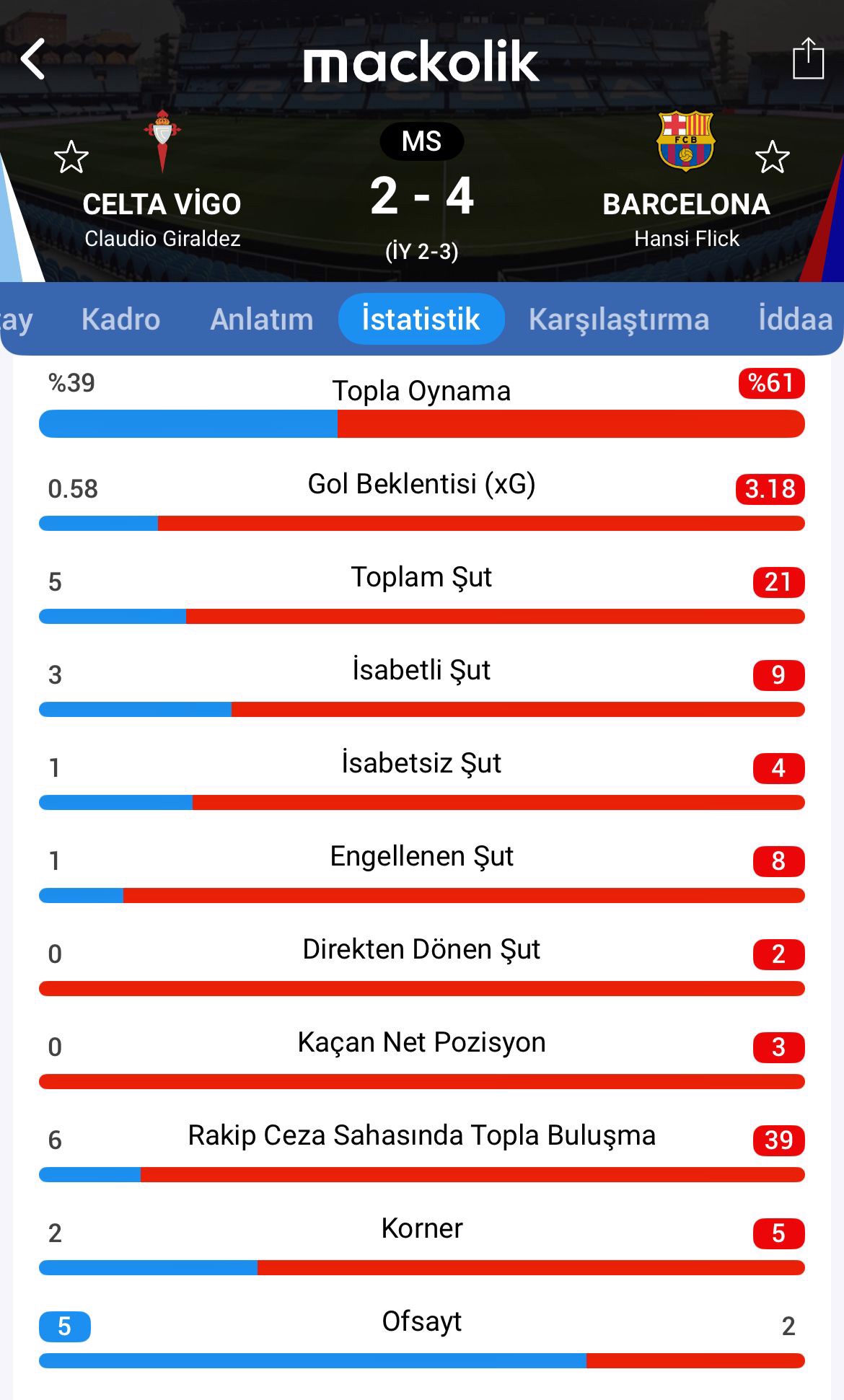 Balaidos Stadı'nda oynanan mücadelenin 10. dakikasında konuk ekip Barcelona, Robert Lewandowski'nin penaltıdan attığı golle 1-0 öne geçti.