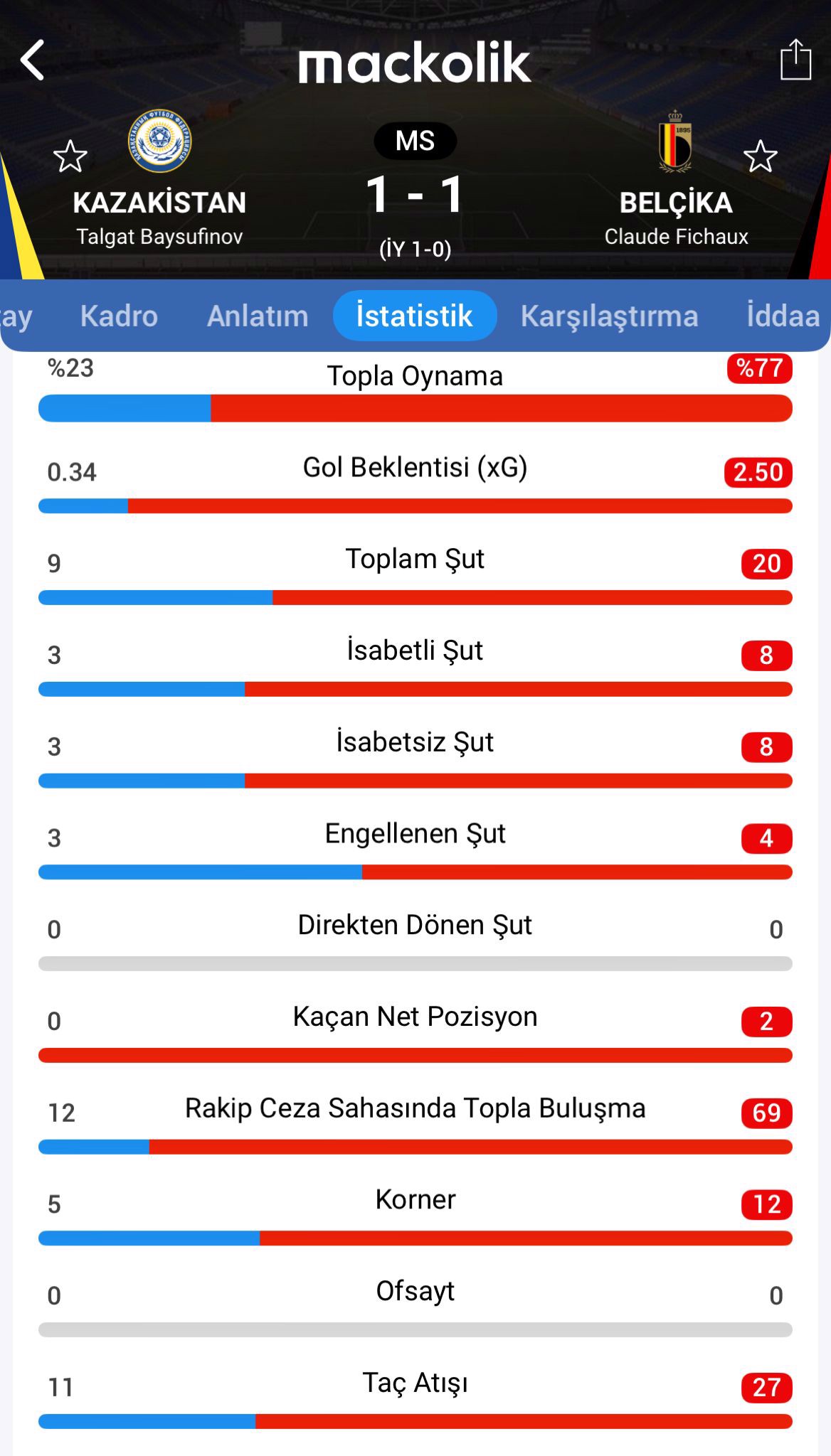 2026 Dünya Kupası Elemeleri J Grubu'nda Kazakistan ile Belçika, 1-1 berabere kaldı. Kazakistan'da Islam Chesnokov, kırmızı kart gördü.