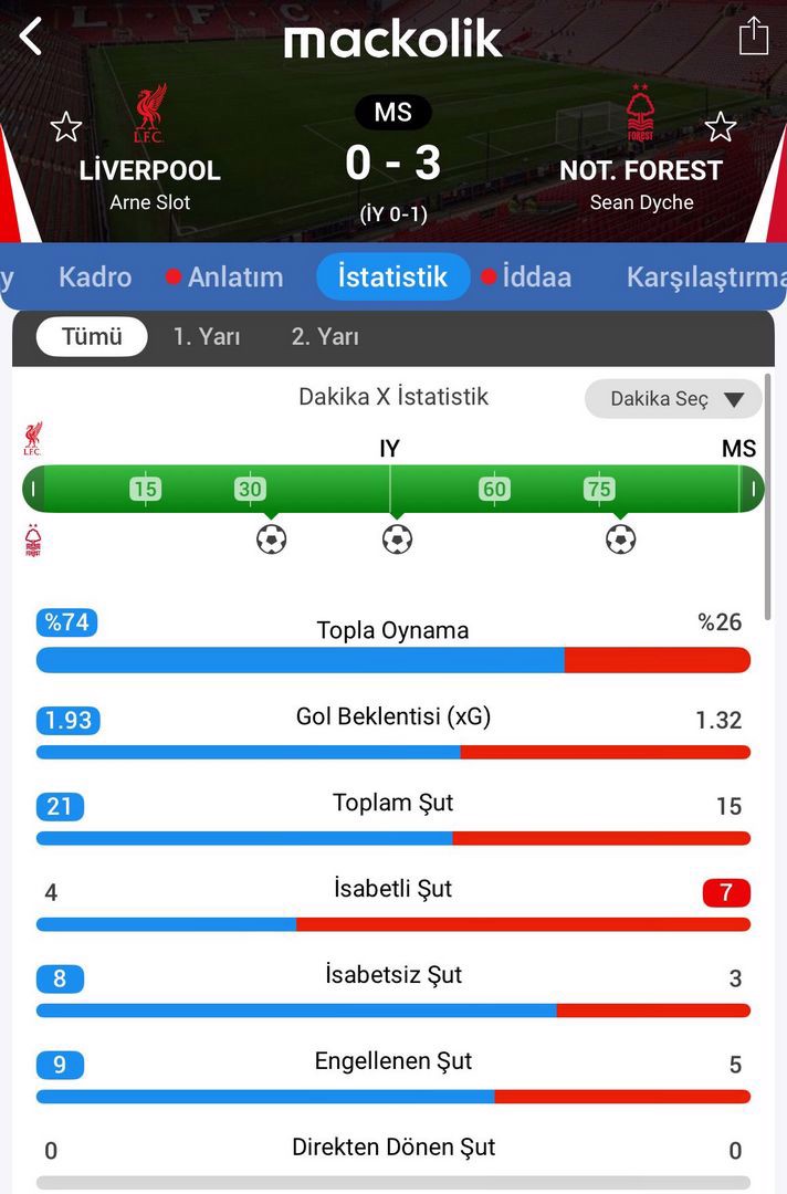 Premier Lig'de Liverpool evinde Nottingham Forest'a 3-0 mağlup oldu. Arne Slot'un öğrencileri ligde oynadığı son 7 maçın 6'sını kaybetti.