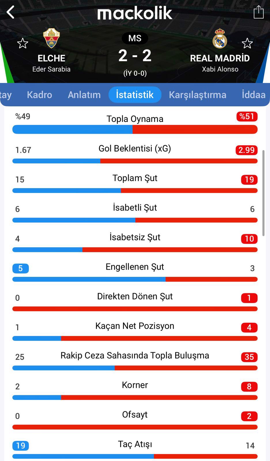 Bu sonuçla Xabi Alonso'nun öğrencileri ligde 32 puana yükselerek liderlik koltuğundaki yerini korurken Elche puanını 16 yaptı.