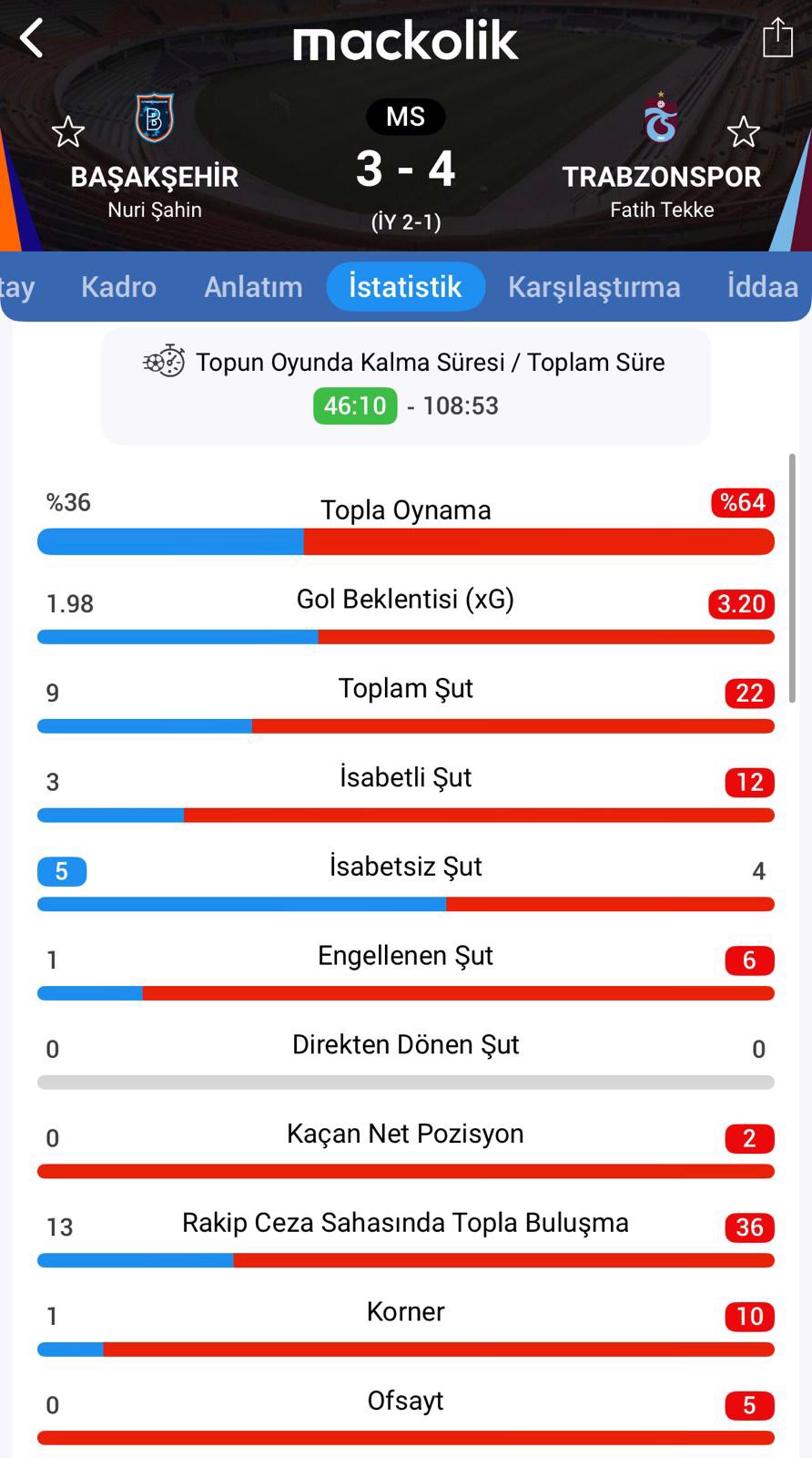 Süper Lig'in 13. haftasında Trabzonspor deplasmanda 10. dakikada 10 kişi kalan Başakşehir'i duraklamalarda 4-3 mağlup etti. Bordo-mavililer yenilmezlik serisini 8 maça çıkardı.