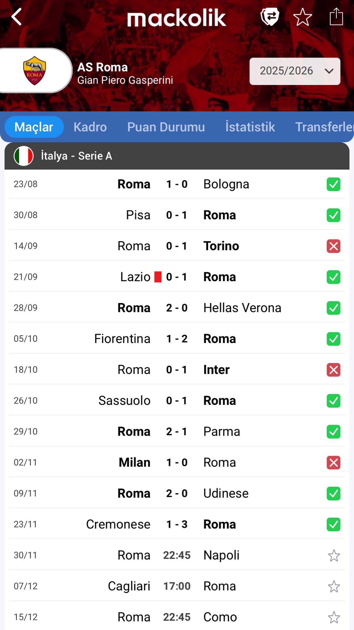 Roma, şu ana kadar topladığı 27 puan (dokuz galibiyet, üç mağlubiyet) ile lider. En dikkat çekici istatistik ise, ligin en az gol yiyen takımı olmaları; kalelerinde sadece altı gol gördüler.