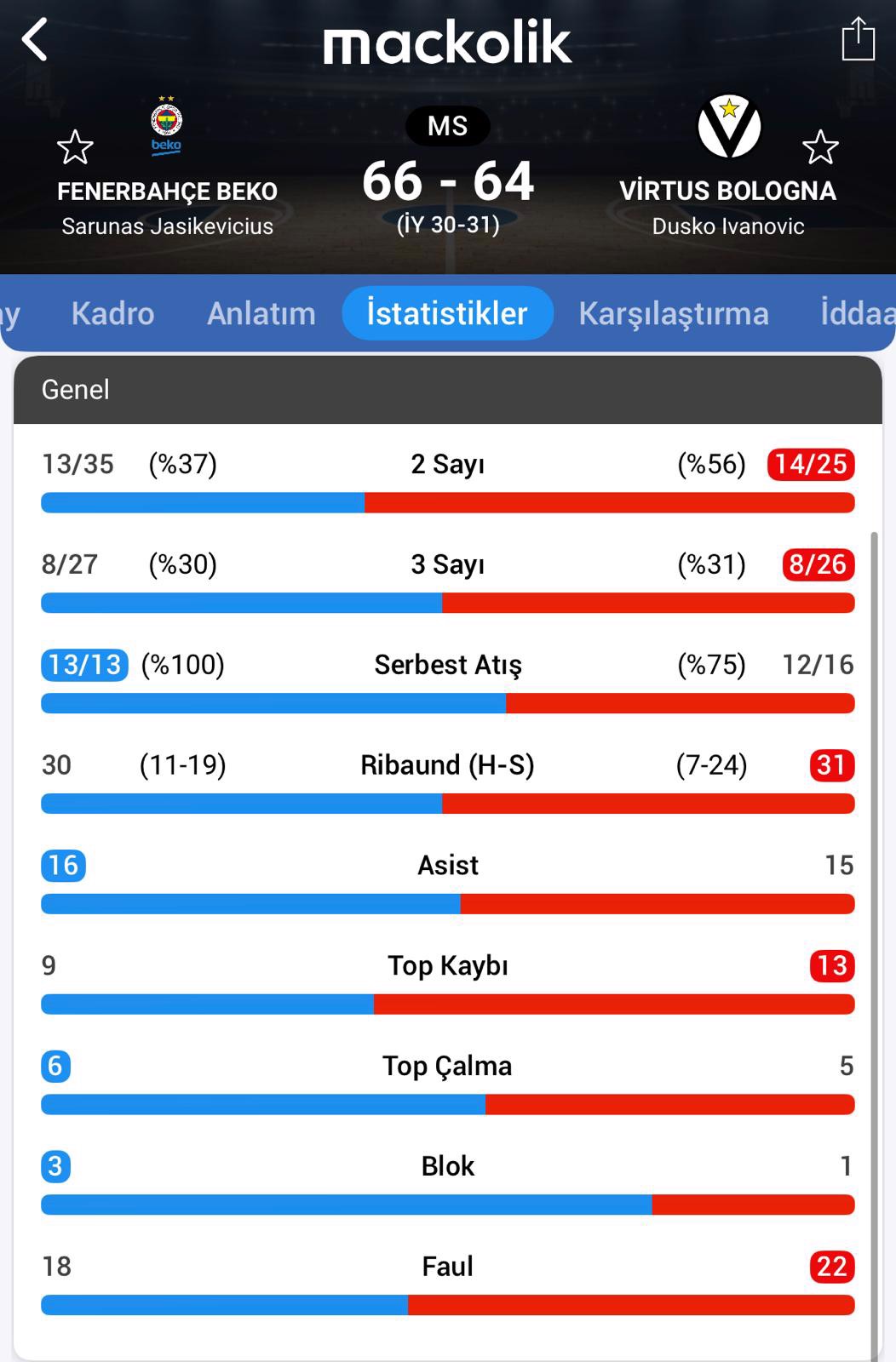 İlk çeyreği 17-15 geride kapatan sarı-lacivertliler ikinci çeyrekte de kafa kafaya mücadeleyi sürdürdü ve devre arasına 31-30 Virtus Bologna üstünlüğüyle girildi.