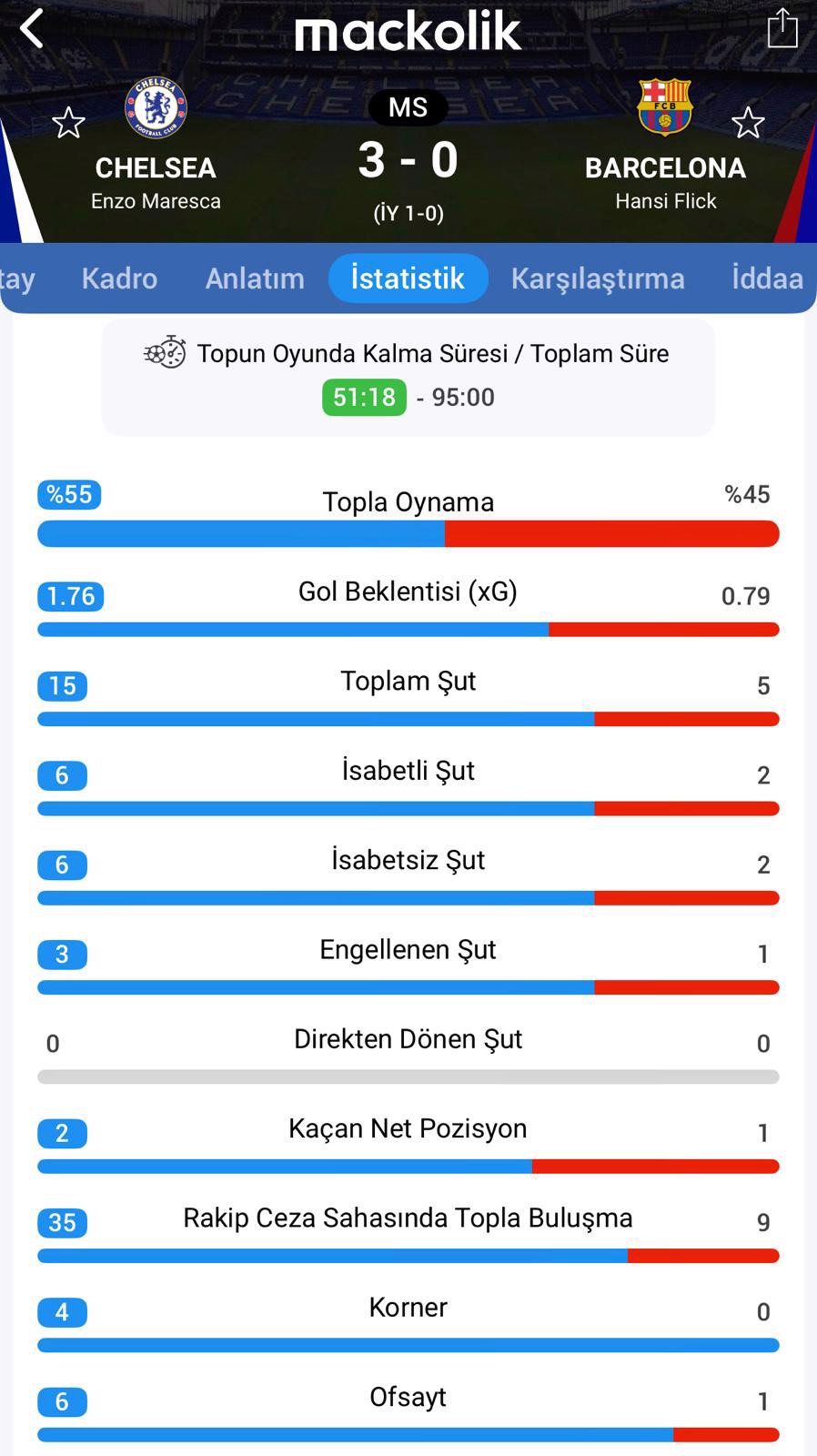 Şampiyonlar Ligi'nin 5. haftasında Chelsea konuk ettiği Barcelona'yı 3-0'lık farklı skorla yendi. Katalanlar'da 44. dakikada ikinci sarı karttan kırmızı kart gören Araujo takımını 10 kişi bıraktı.