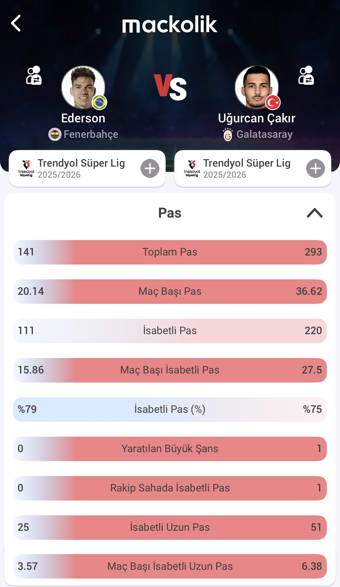 Bu sezon 7 maçta 630 dakika süre alan sarı-lacivertli kalecinin Mackolik ortalama puanı 6.71 iken sarı-kırmızılı eldiven ise 8 maçta 720 dakika süre buldu ve 7.34'lük Mackolik ortalama puanına sahip.