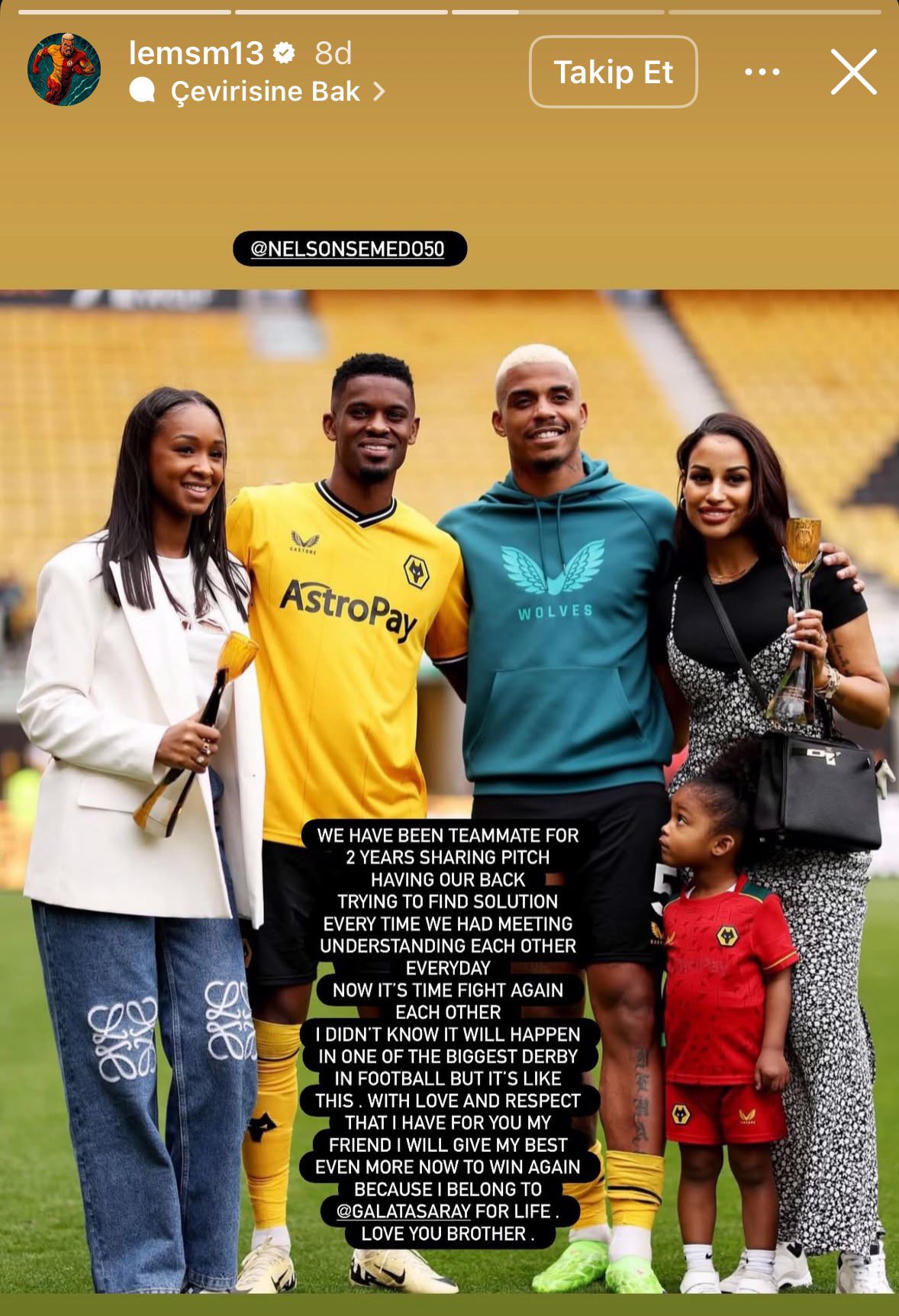 Lemina, Semedo'nun Fenerbahçe'ye transferiyle ilgili bir paylaşım yapmış ve "İki yıl boyunca aynı takımın formasını giyip aynı sahayı paylaştık. Her buluştuğumuzda birbirimizi anlayıp beraber çözümler aradık. Şimdi ise birbirimize karşı mücadele edeceğiz. Seni seviyorum kardeşim" ifadelerini kullanmıştı.