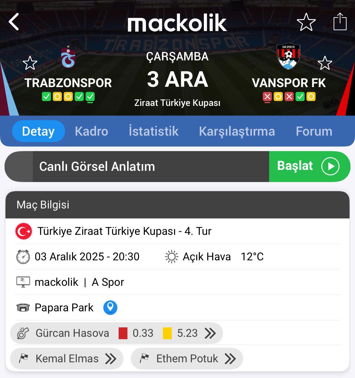 Trabzonspor ile İmaj Altyapı Vanspor arasında Papara Park'ta oynanacak mücadele saat 20.30'da başlayacak. Karşılaşmayı hakem Gürcan Hasova yönetecek.