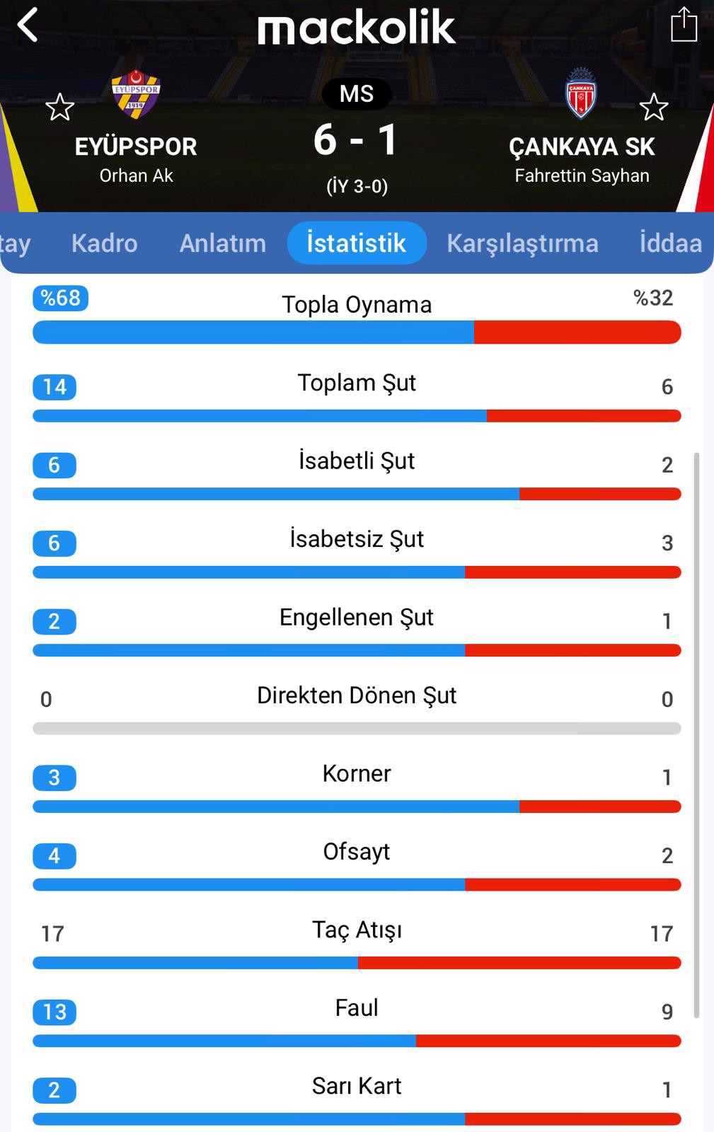 Maçta golleri Eyüpspor adına 9. dakikada Seşlar, 15. dakikada Metehan Altunbaş, 25. dakikada Ampem, 82. dakikada Saiz (P), 85. dakikada Sadia, 90+2. dakikada Legowski; Çankaya SK adına 48. dakikada Tunahan Akpınar kaydetti.