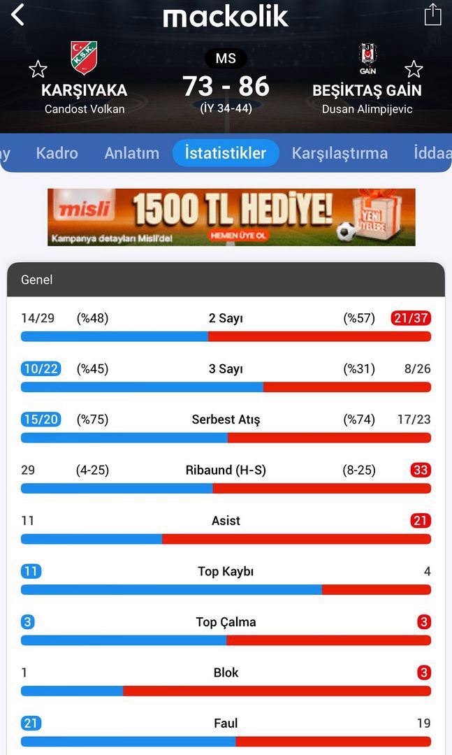 Türkiye Sigorta Basketbol Süper Ligi'nin 10. haftasında Karşıyaka ile Beşiktaş Gain karşılaştı.