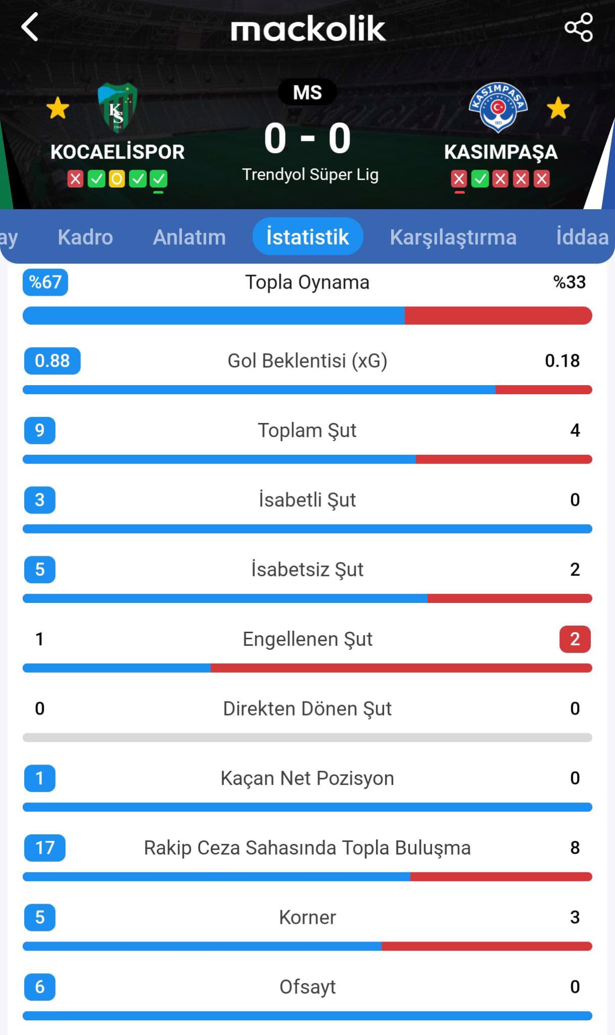 Karşılaşmada başka gol olmadı ve Kocaelispor ile Kasımpaşa 0-0 berabere kaldı.