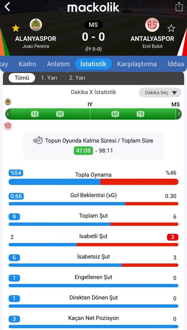 71. dakikada Alanyaspor'un sol kanattan Hagi ile kullandığı kornerde ceza sahasında iyi yükselen Lima'nın kafa vuruşunda top, üst direğe çarpıp dışarı çıktı.