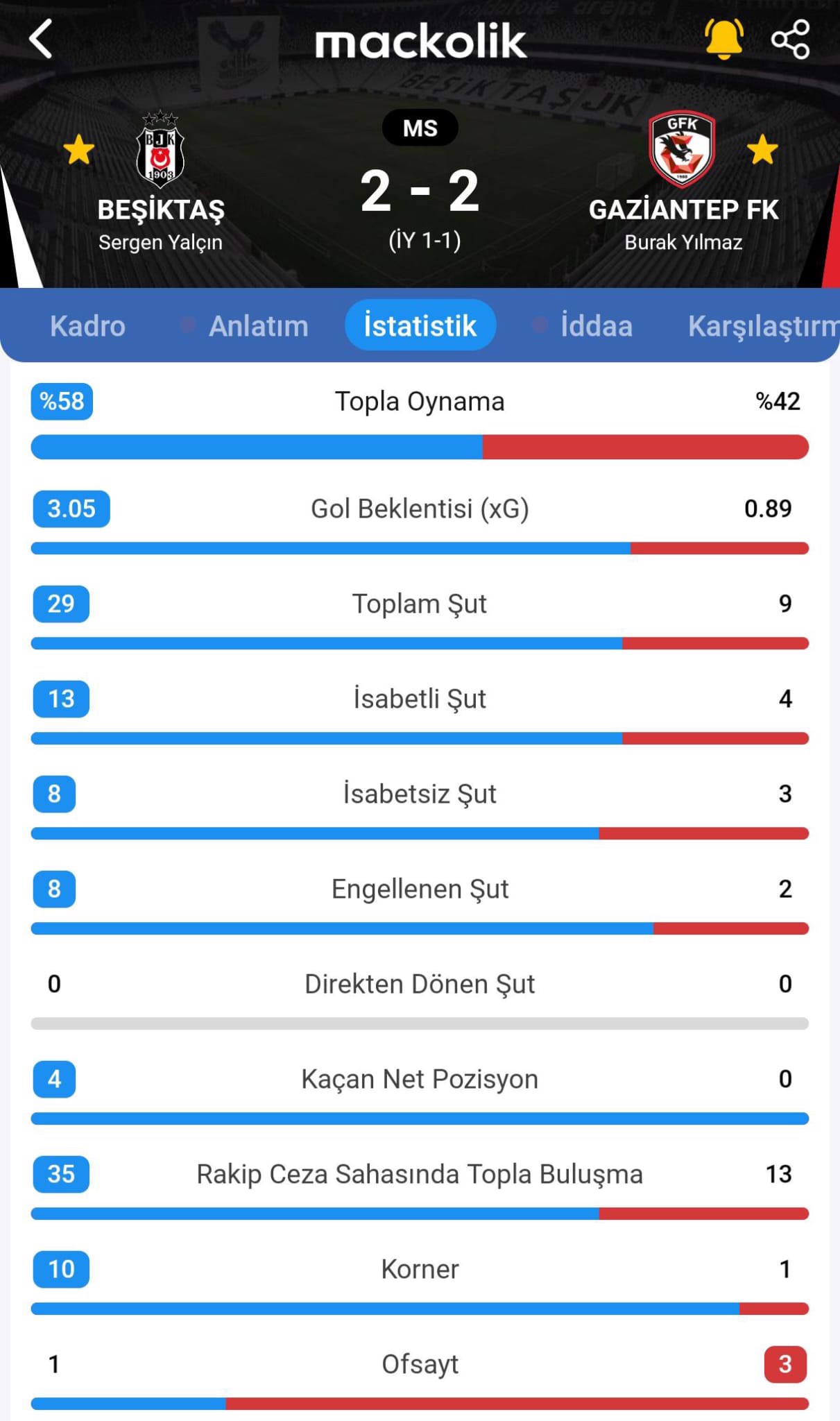Karşılaşmada başka gol olmadı ve Beşiktaş evinde Gaziantep FK ile 2-2 berabere kaldı.