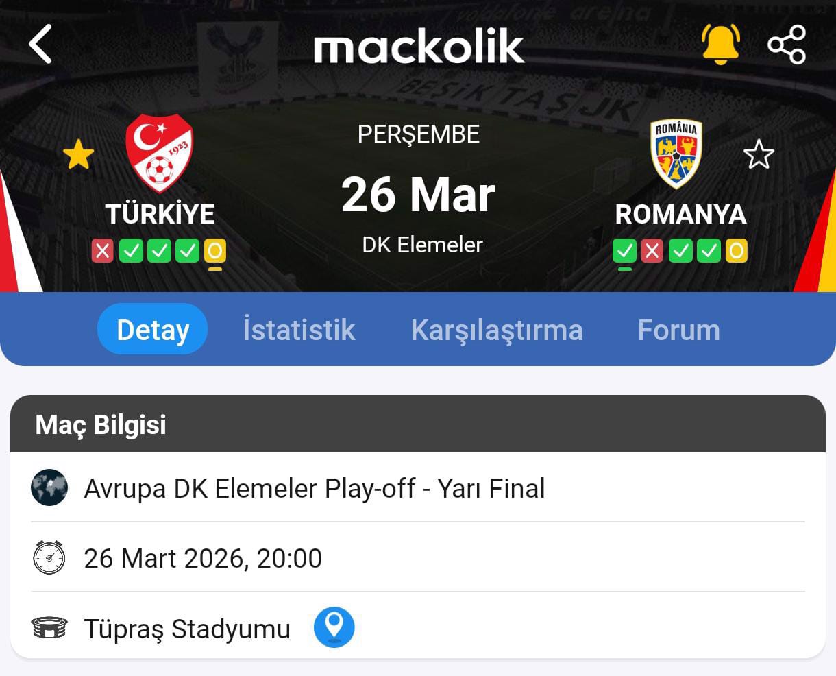 "2026 FIFA Dünya Kupası Elemeleri play-off turu yarı finalinde Romanya ile kendi sahasında karşılaşacak A Millî Takımımız, bu müsabakayı İstanbul'da oynayacak. Beşiktaş Park'ın ev sahipliği yapacağı maç, 26 Mart 2026 Perşembe günü saat 20.00'de başlayacak.
