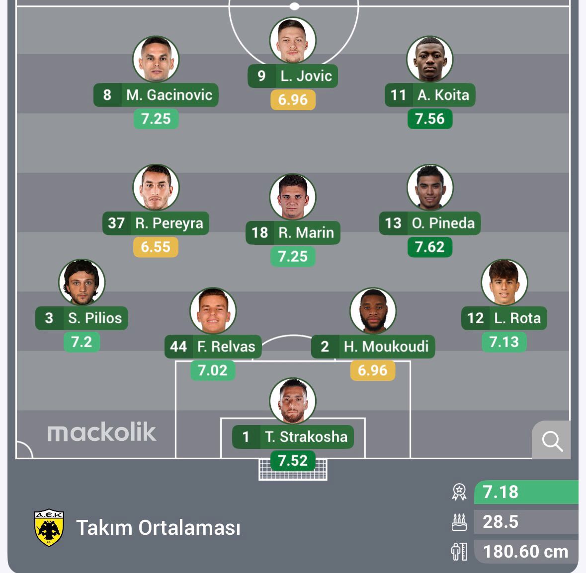 AEK: Strakosha, Rota, Moukoudi, Relvas, Pilios, Pineda, Marin, Pereyra, Koita, Jovic, Gacinovic