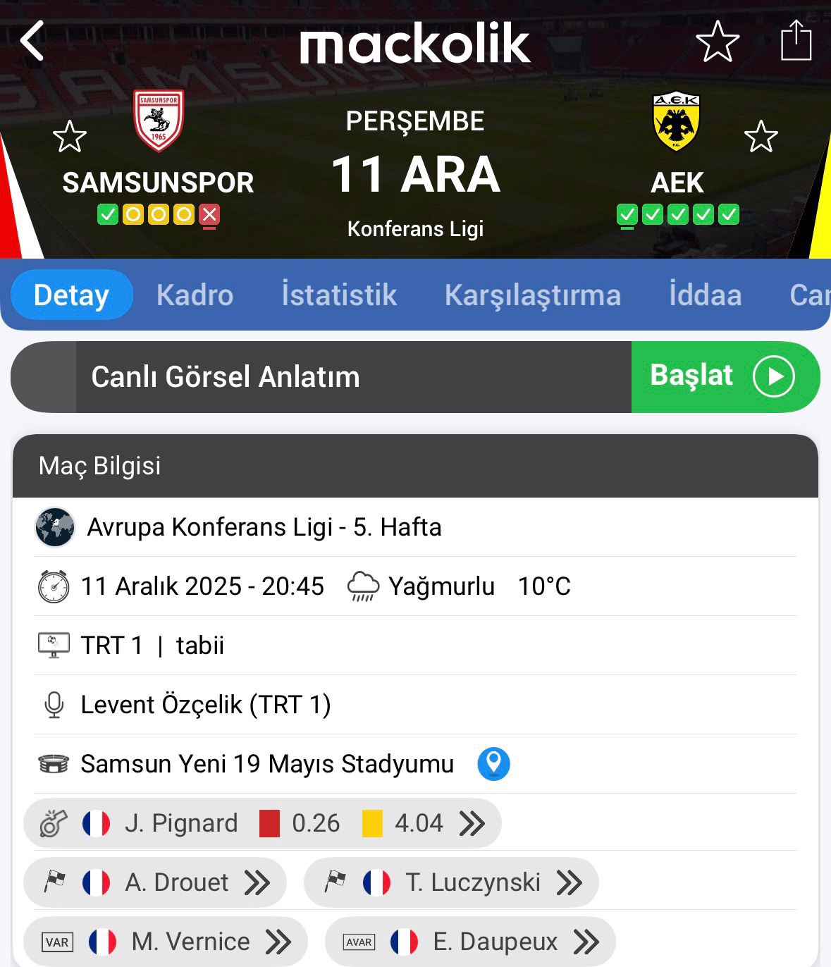 UEFA Konferans Ligi'nin 5. haftasında temsilcimiz Samsunspor evinde Yunanistan ekibi AEK ile karşılaşıyor.