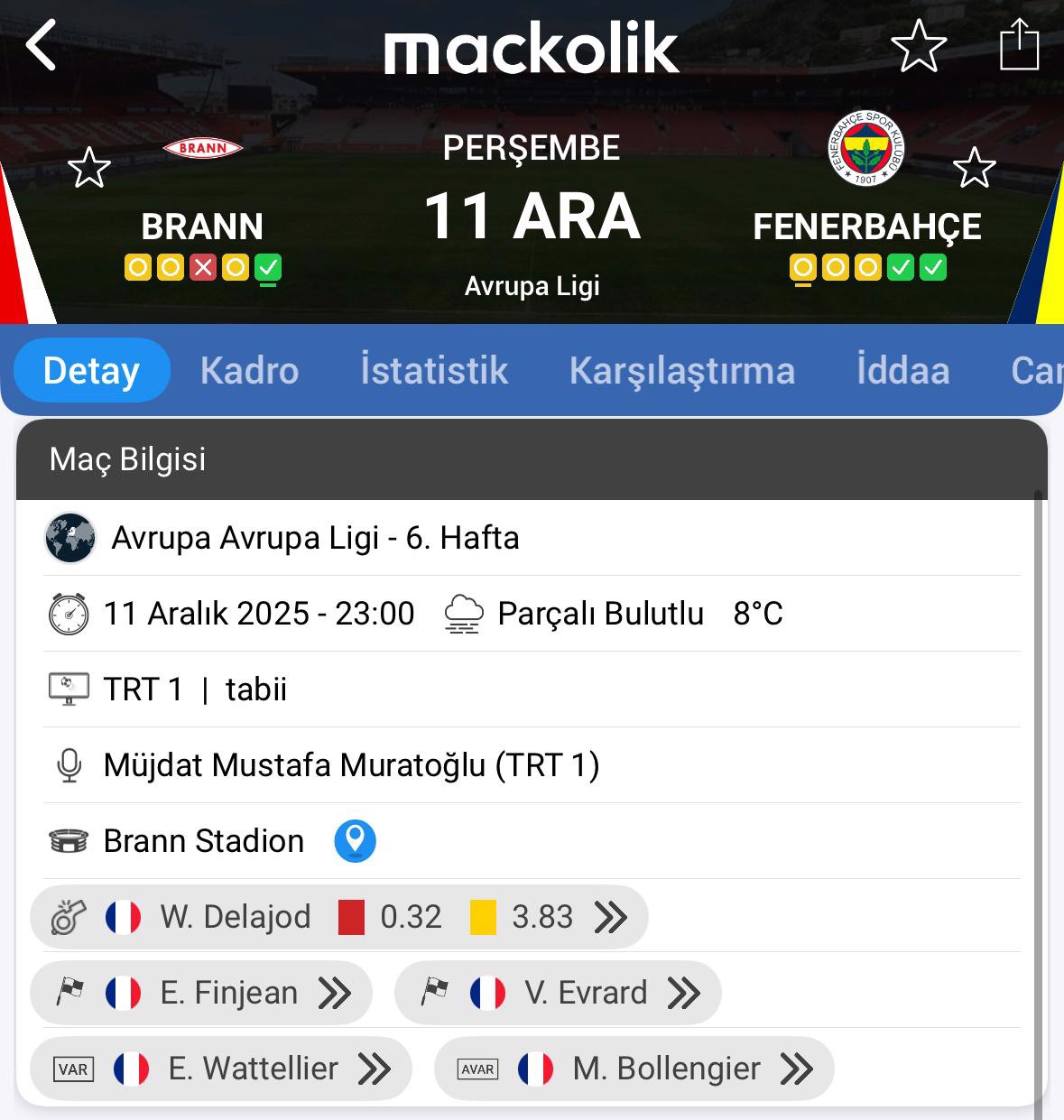 UEFA Avrupa Ligi'nin 6. haftasında temsilcimiz Fenerbahçe deplasmanda Norveç kulübü Brann ile karşı karşıya geliyor.