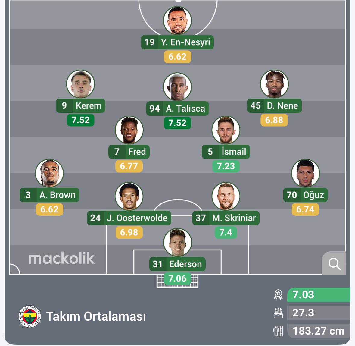 Fenerbahçe: Ederson, Oğuz Aydın, Skriniar, Oosterwolde, Brown, İsmail Yüksek, Fred, Nene, Talisca, Kerem Aktürkoğlu, En-Nesyri