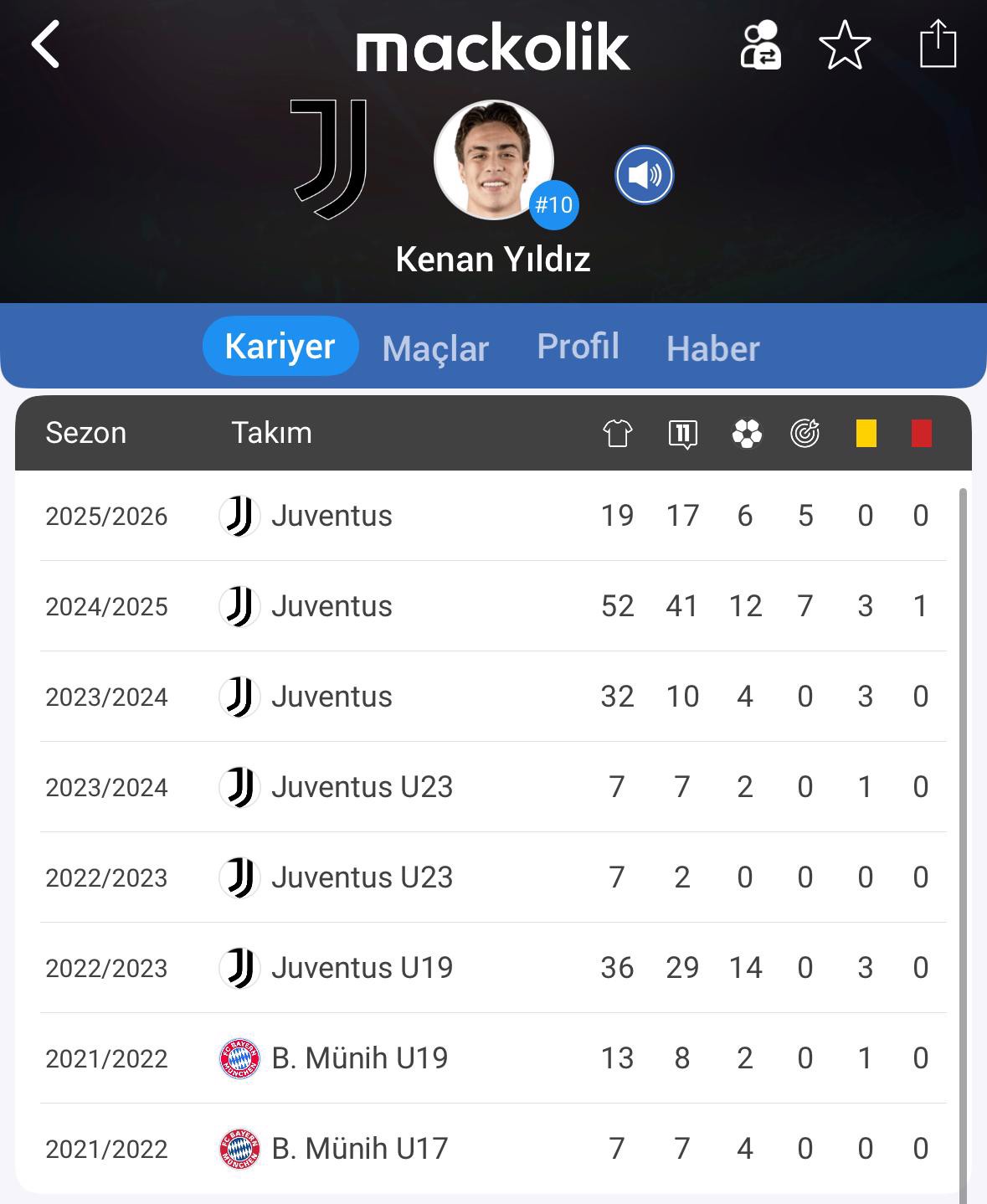 Kenan Yıldız, Juventus A Takımı'yla boy gösterdiği üçüncü sezonda şu zaman kadar 19 maça çıkarken 6 gol attı, 5 asist yaptı. Üç sezonun toplamında ise 103 maçta 22 gol katkısı sağladı.