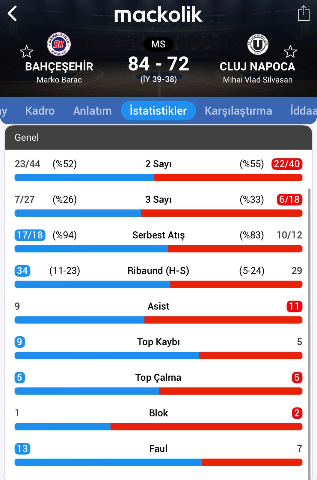 Bu sonuçla Marco Barac'ın öğrencileri ligdeki 7. galibiyetini alırken Cluj Napoca, 5. kez mağlup oldu.