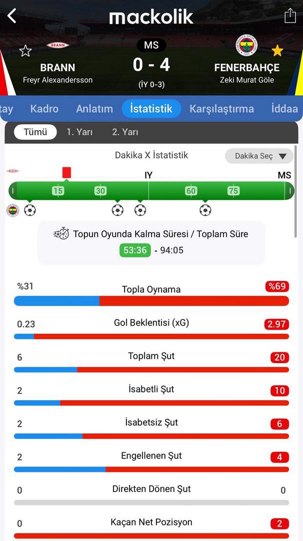 Maçın kalan bölümünde gol sesi çıkmadı ve Fenerbahçe sahadan 4-0 galip ayrıldı.