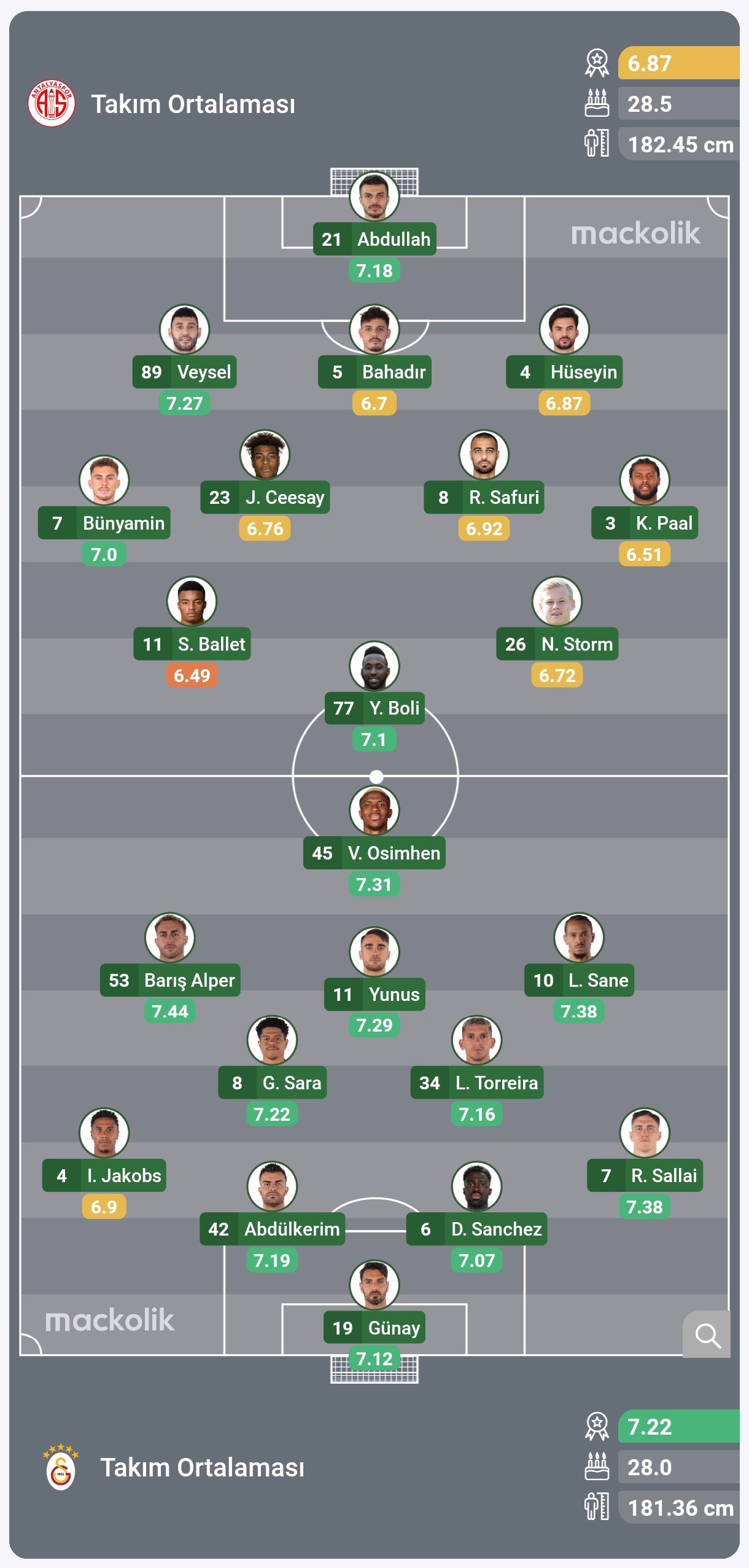Galatasaray: Günay Güvenç, Sallai, Sanchez, Abdülkerim Bardakcı, Jakobs, Torreira, Sara, Sane, Yunus Akgün, Barış Alper Yılmaz, Osimhen