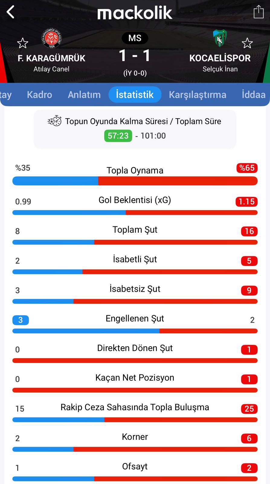 Süper Lig'in 16. haftasında Mısırlı.com.tr Fatih Karagümrük ile Kocaelispor, Atatürk Olimpiyat Stadı'nda oynanan mücadelede 1-1 berabere kaldı.