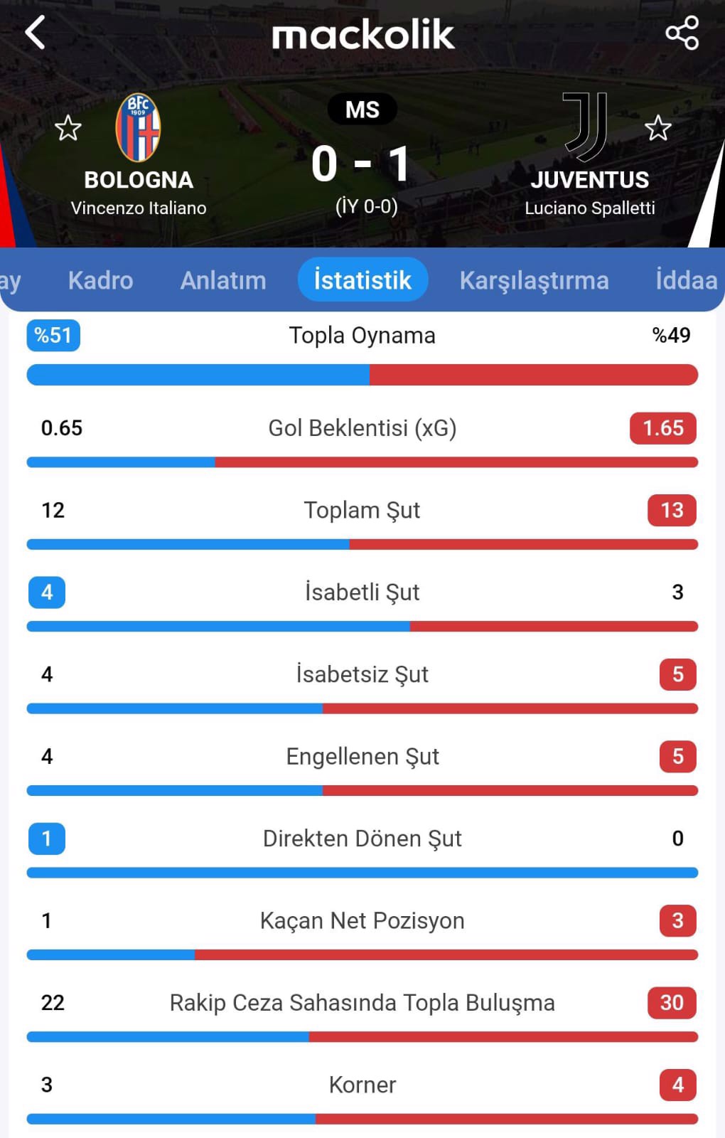 Renato Dall'Ara Stadyumu'nda oynanan karşılaşmanın ilk yarısında iki ekip de gol bulamadı ve soyunma odasına 0-0 eşitlikle gidildi.