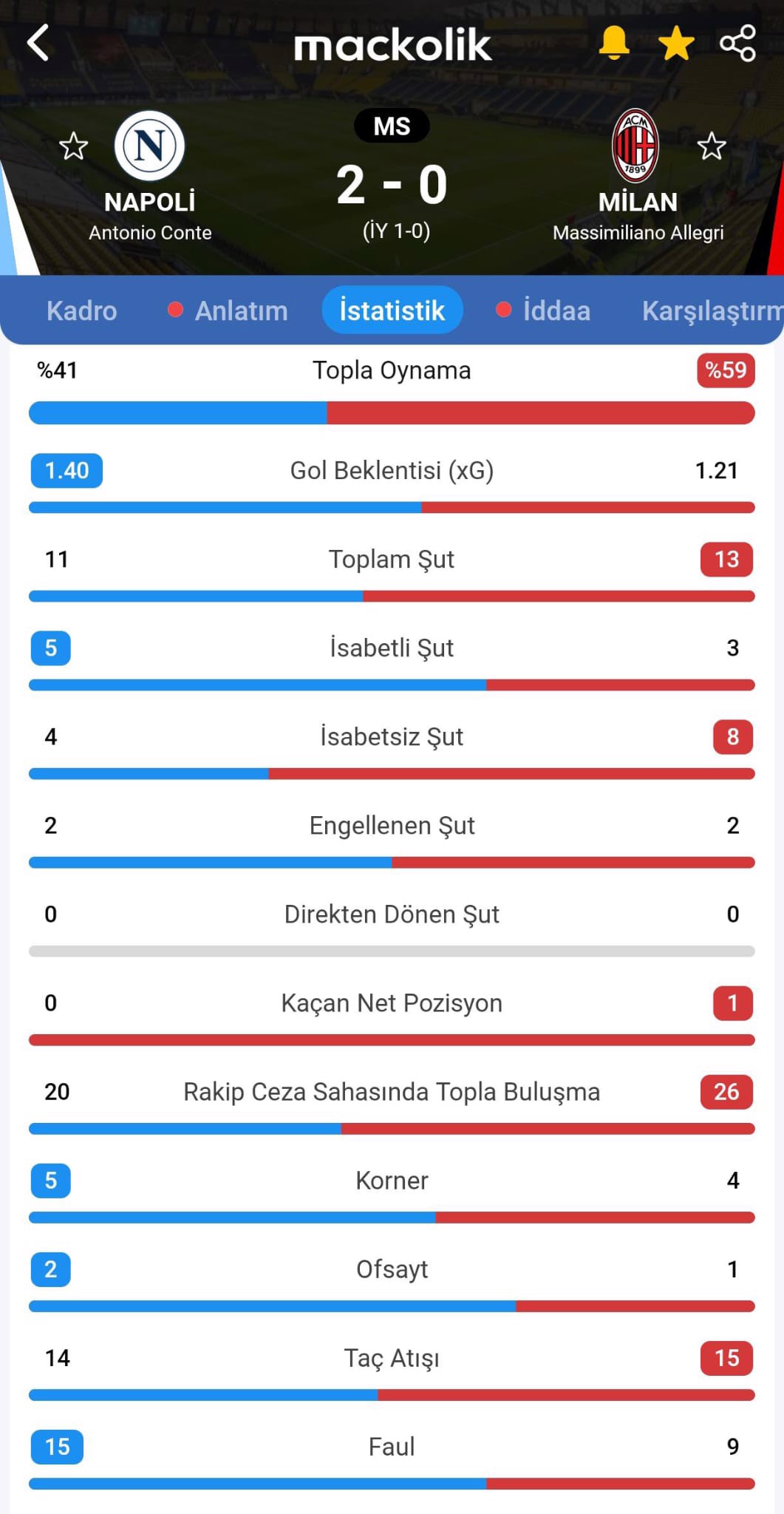 İlk yarı 1-0 Napoli üstünlüğüyle sonuçlandı.