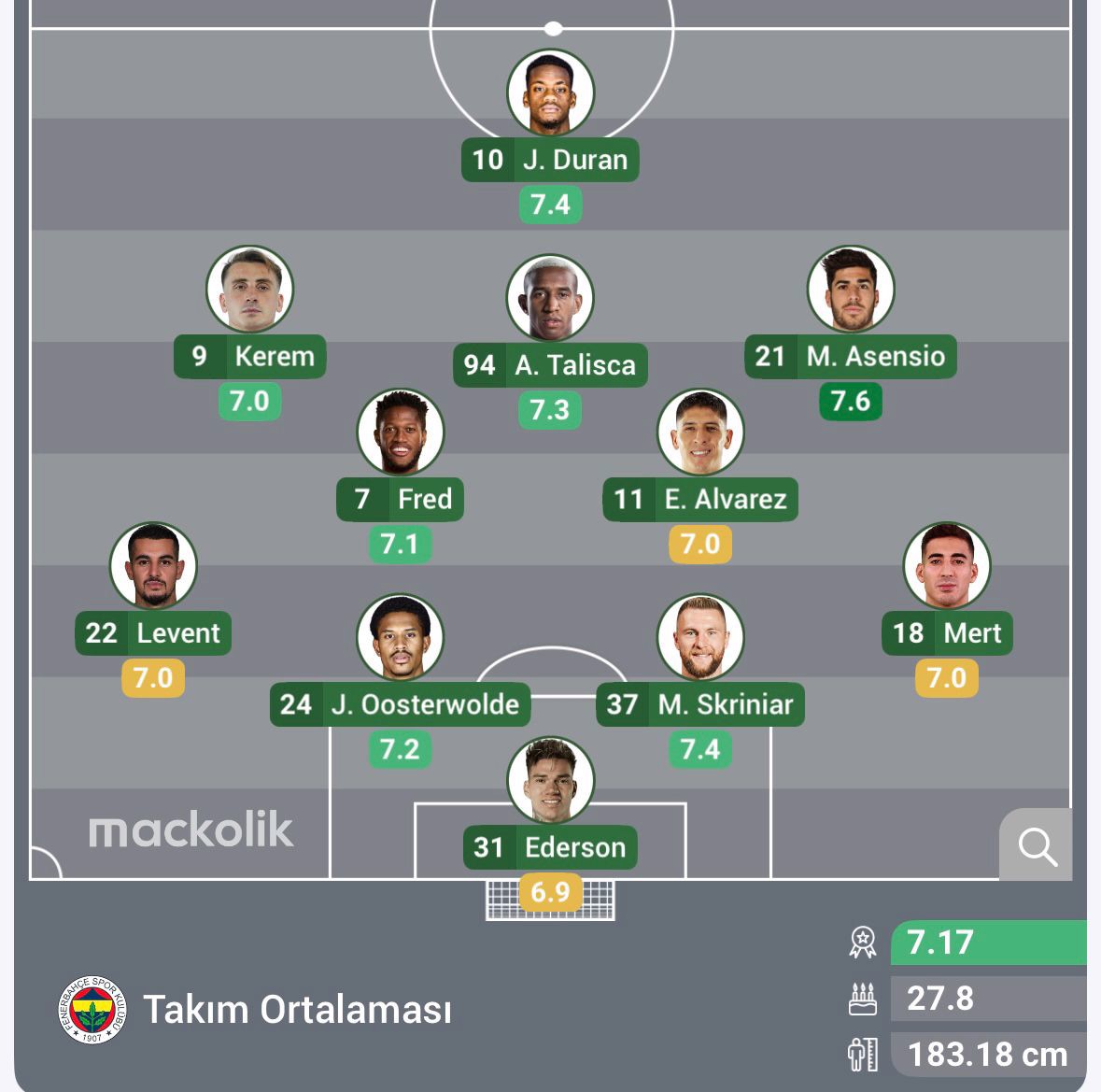 Fenerbahçe: Ederson, Mert Müldür, Skriniar, Oosterwolde, Levent Mercan, Alvarez, Fred, Asensio, Talisca, Kerem Aktürkoğlu, Jhon Duran