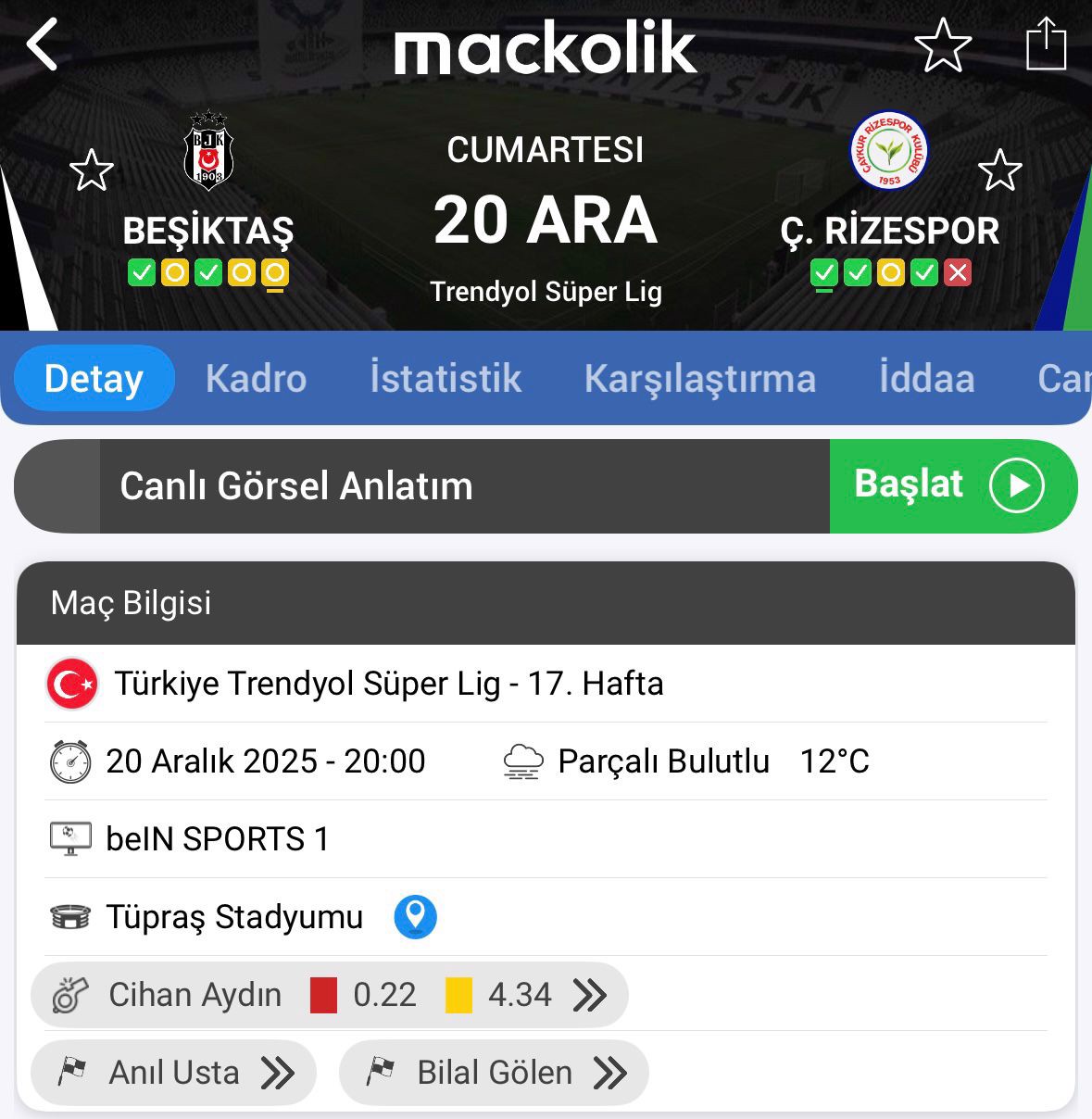 Süper Lig'in 17. hafta maçında Beşiktaş, evinde Çaykur Rizespor'u konuk ediyor.