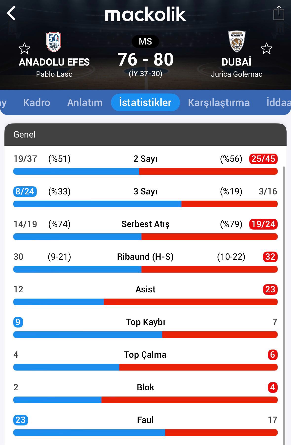 EuroLeague'de Anadolu Efes, evinde Dubai Basket'e 80-76 mağlup oldu. Lacivert-beyazlılar, Pablo Laso ile Avrupa'daki 2. maçını kaybederek 11. mağlubiyetini aldı.