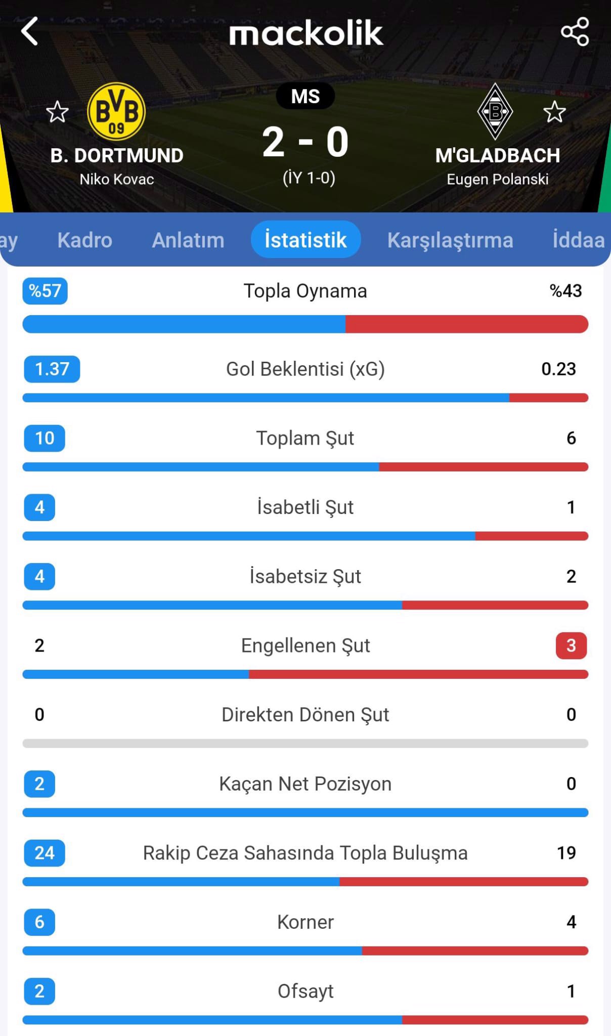 Karşılaşmayı 2-0 kazanan Borussia Dortmund puanını 32'ye yükseltirken, Borussia Mönchengladbach 16 puanda kaldı.