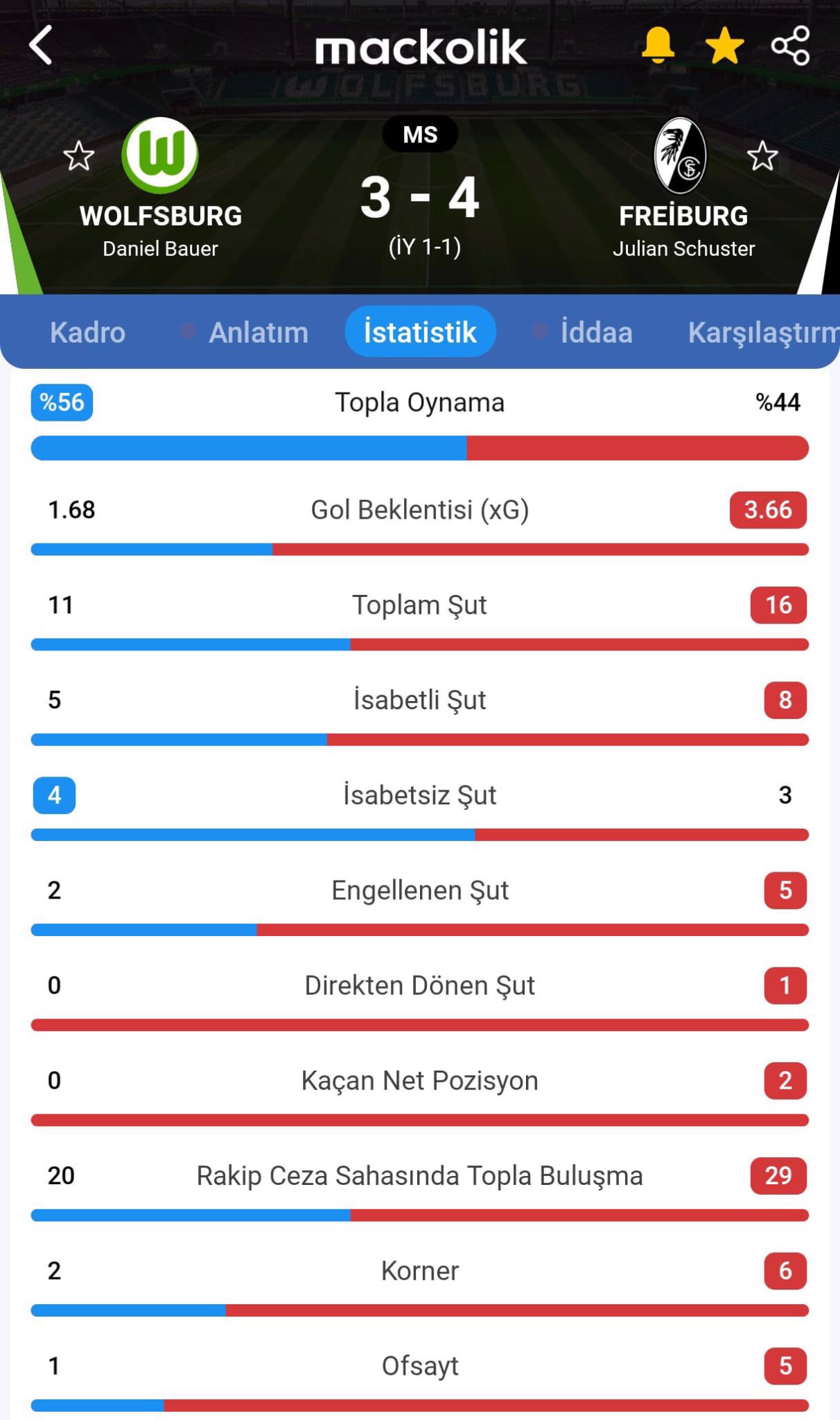 Bu sonuçla Freiburg puanını 20'ye yükseltirken, Wolfsburg 15 puanda kaldı.