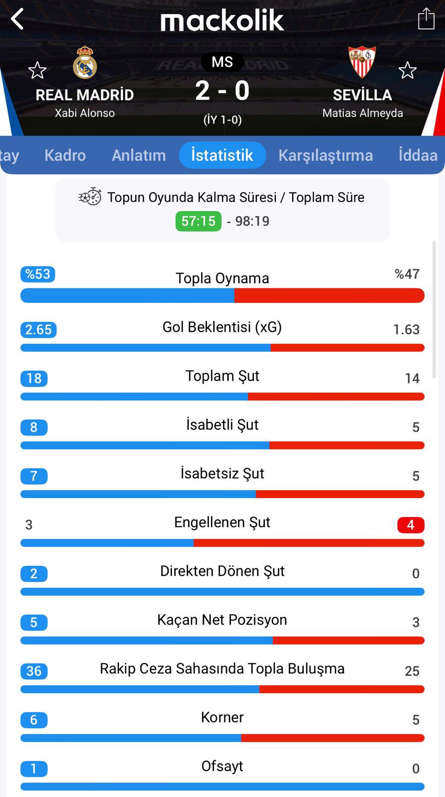 Bu sonuçla Xabi Alonso'nun öğrencileri puanını 42 yaparak ligin ilk yarısını ikinci sırada tamamladı. Endülüs ekibi ise 20 puanda kaldı.
