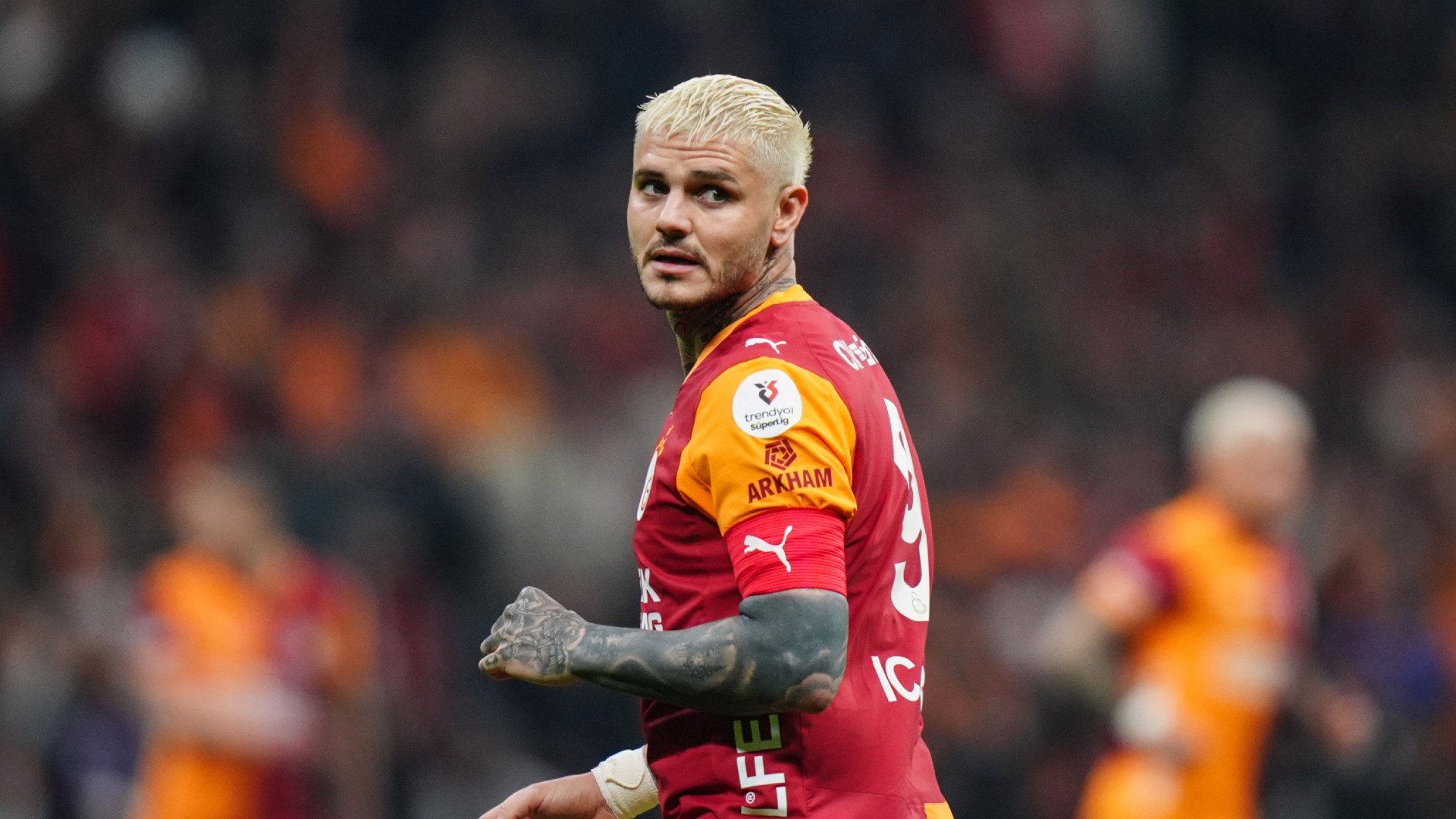 Galatasaraylı taraftarlar, ısınma sırasında Arjantinli futbolcu Mauro Icardi'ye destekte bulundu.