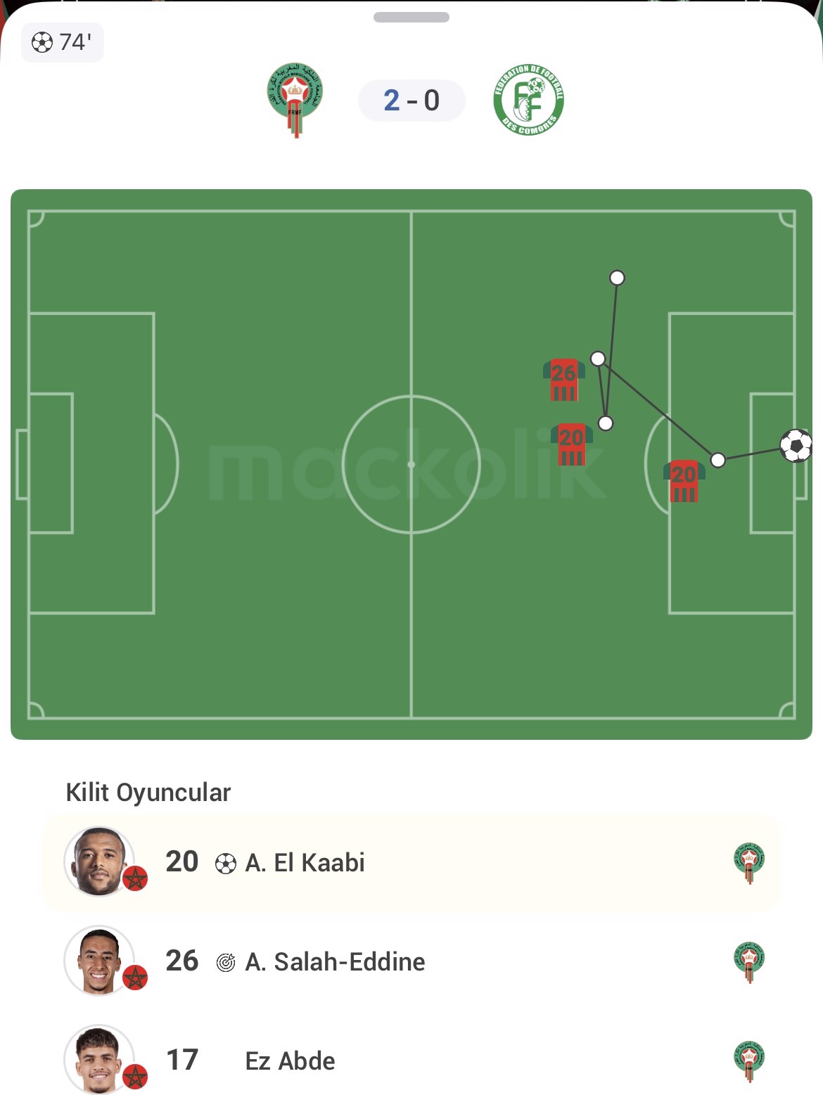 55. dakikada topu ağlarla buluşturan Diaz, FasKomorlar karşısında öne geçirdi. El Kaabi, 74. dakikada kaydettiği golle maçın skorunu belirledi.