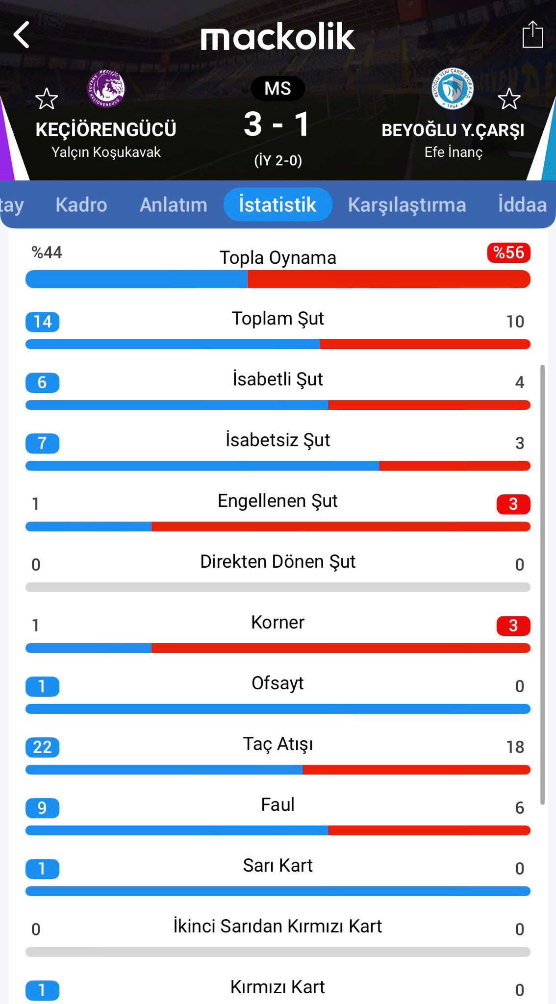 37. dakikada Keçiörengücü'nde kaleci ile karşı karşıya gelen Ali Akman topu ağlarla buluşturdu ve skoru 2-0'a getirdi.