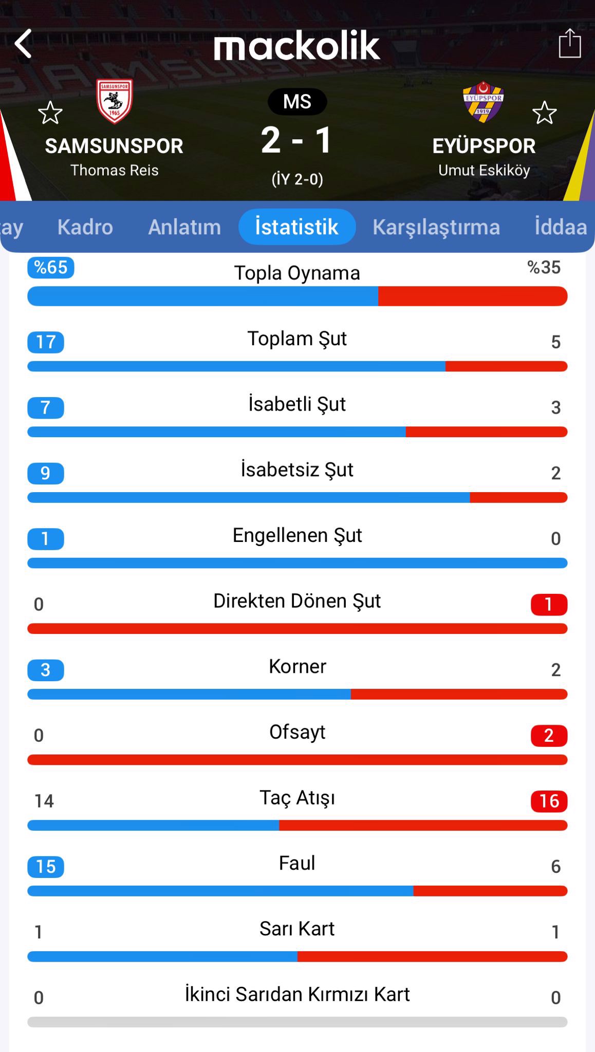 Karşılaşmayı Samsunspor 2-1 kazandı.