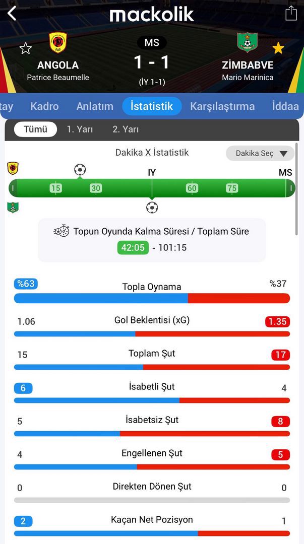 Zimbabve'nin bu gole cevabı 45+6. dakikada Musona ile geldi. Soyunma odasına 1-1'lik eşitlikle gidildi.