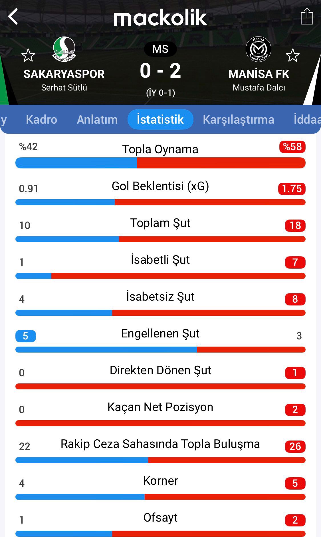 Kalan kısımda başka gol olmadı ve Manisa FK, puanını 23'e çıkardı. Sakaryaspor ise 9. yenilgisini alarak 22 puanda kaldı.