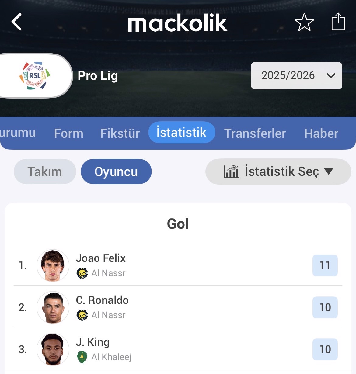 Kariyerinde daha önce Fenerbahçe forması da giyen Joshua King, geride kalan yaz transfer döneminde imza attığı Suudi Arabistan Pro Lig ekibi Al-Khaleej'de yıldızlaştı. Norveçli futbolcu, görev yaptığı 10 maçta takımına 11 gol, 1 asistlik skor katkısı sağladı.