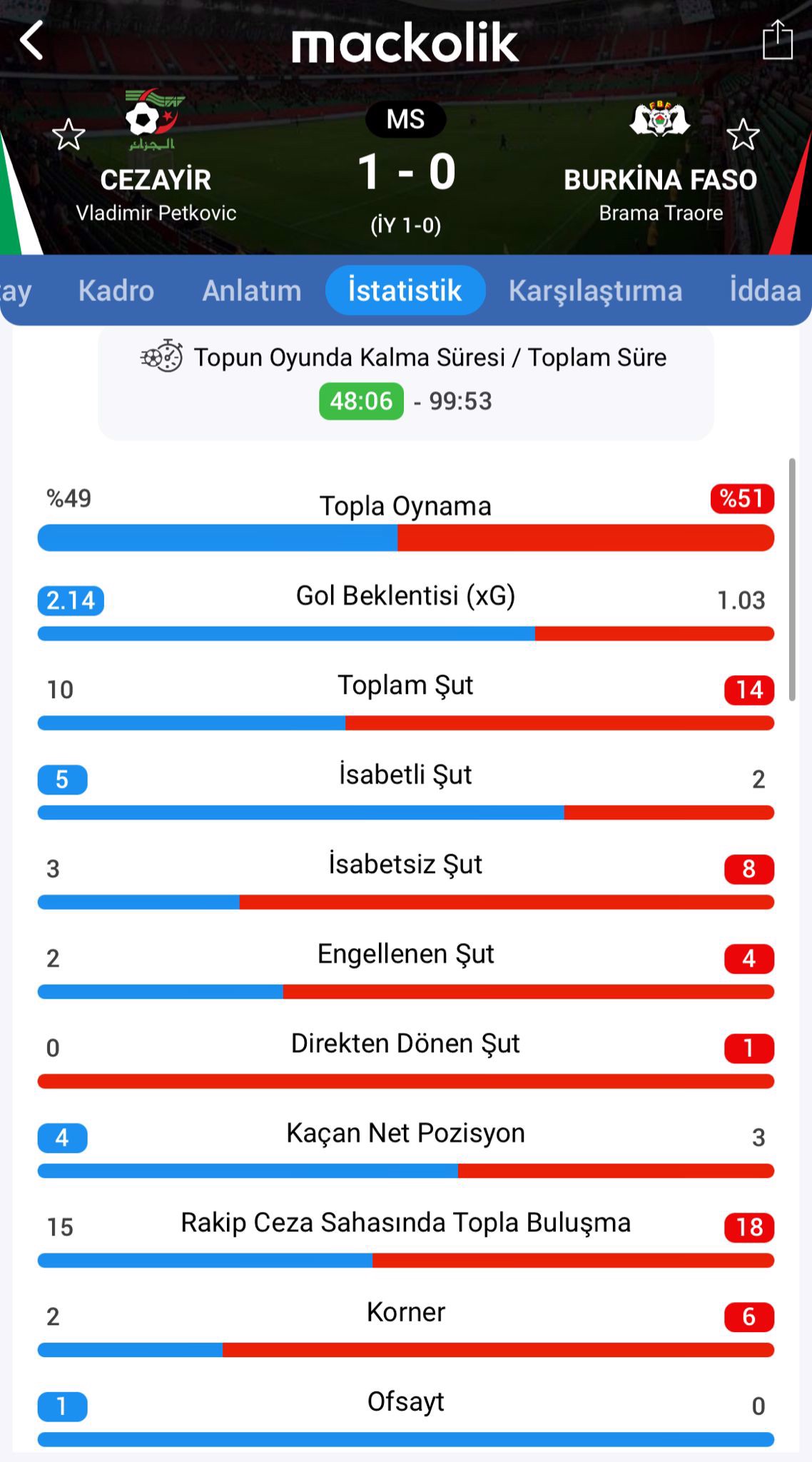 İkinci yarıda gol sesi çıkmadı ve Cezayir maçı 1-0 kazandı.