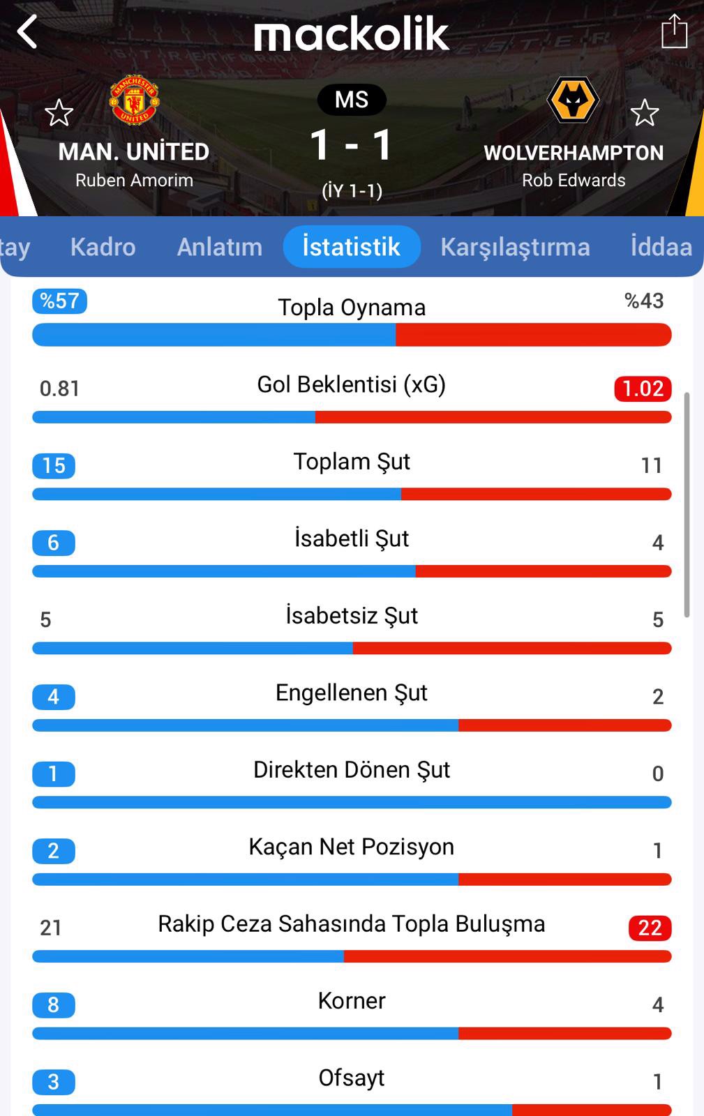 Maçta golleri Kırmızı Şeytanlar adına 27. dakikada Zirkzee; Wolves adına 45. dakikada Krejci kaydetti.