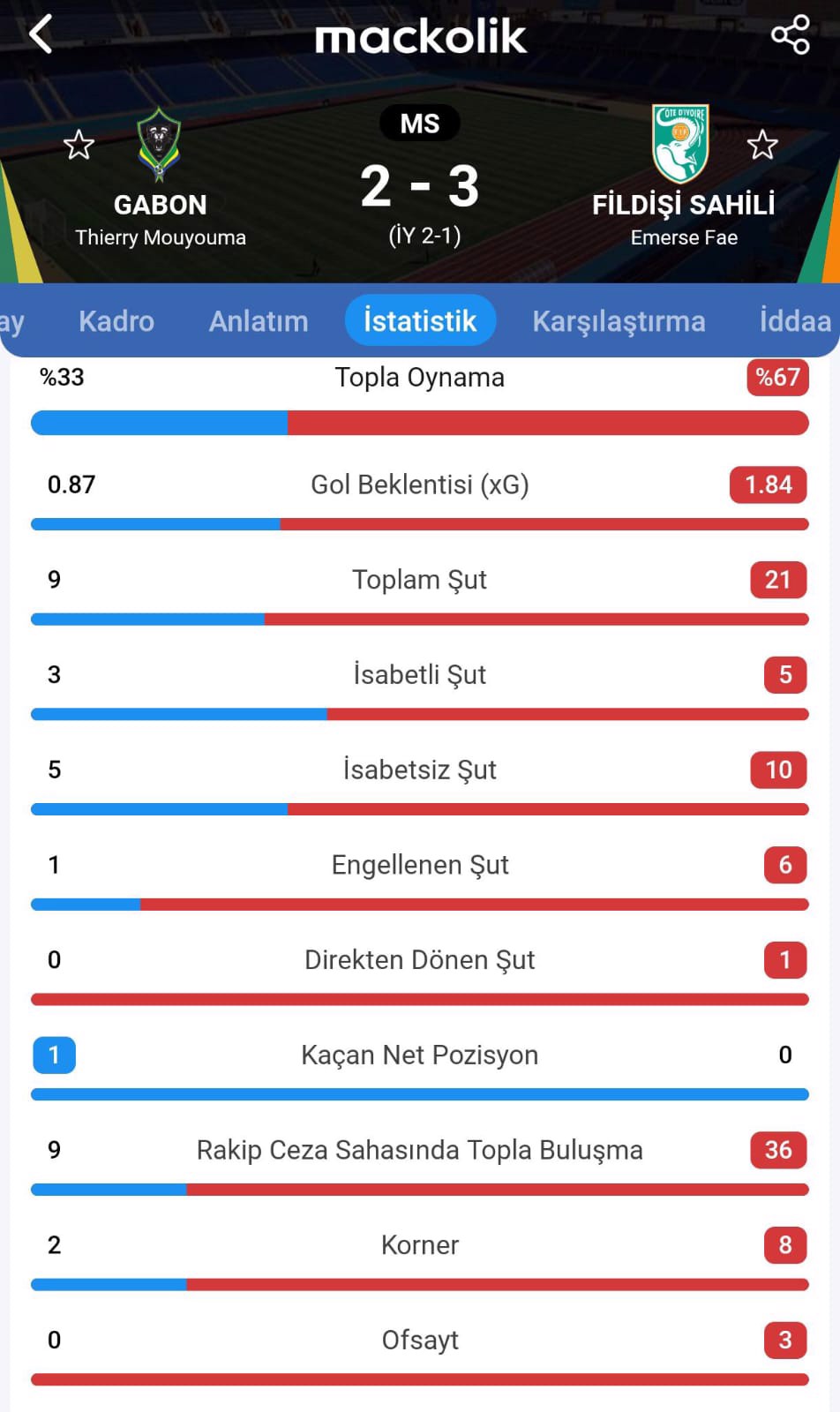 Fildişi Sahili'nde RAMS Başakşehir'den Christopher Operi ve Trabzonspor'dan Christ Inao Oulai, Gabon'da Galatasaray'dan Mario Lemina, mücadelede 90 dakika görev yaptı.