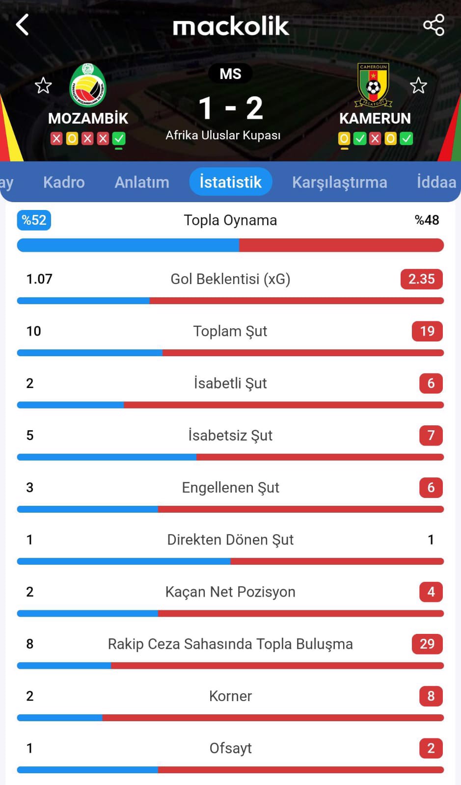 Kamerun ise Mozambik'i Feliciano Jone (kendi kalesine) ve Christian Kofane'ın golleriyle 2-1 yendi. Mozambik'in golünü Geny Catamo attı.