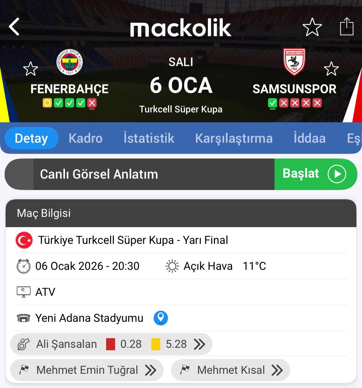 Turkcell Süper Kupa Yarı Final mücadelesinde Fenerbahçe ile Samsunspor, kozlarını paylaşacak.