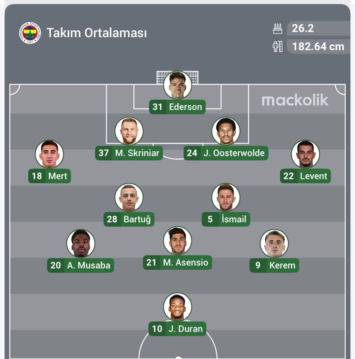 Fenerbahçe: Ederson, Mert, Skriniar, Oosterwolde, Levent, Bartuğ, İsmail, Musaba, Asensio, Kerem, Jhon Duran