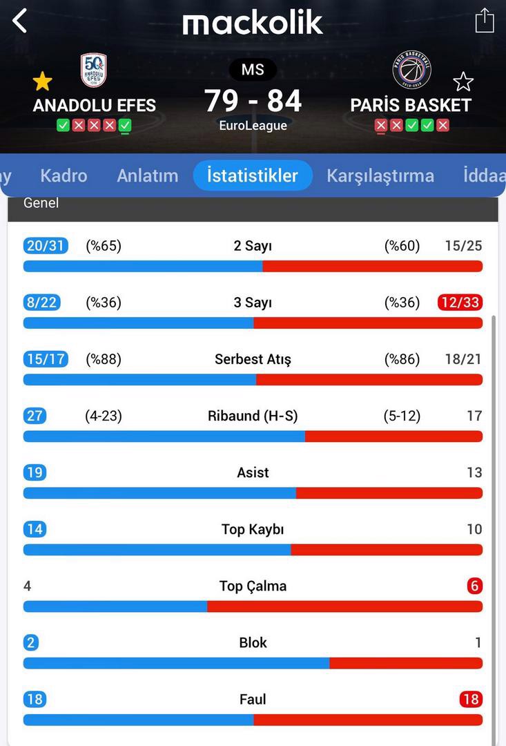 EuroLeague'de Anadolu Efes, Fransız ekibi Paris Basket'e 84-79'luk skorla mağlup oldu. Lacivert-beyazlılar, Avrupa'da üst üste 4. kez kaybetti.