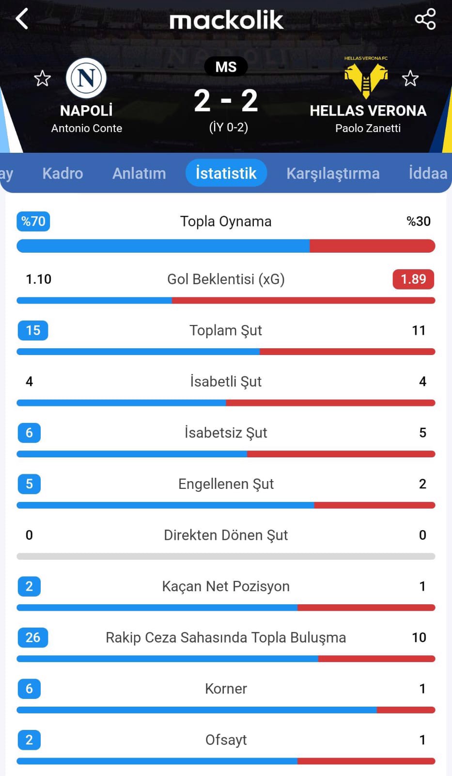 Serie A'nın 19. haftasında Napoli, iki farklı geriye düştüğü maçta Hellas Verona ile 2-2 berabere kalarak sahadan 1 puanla ayrıldı.