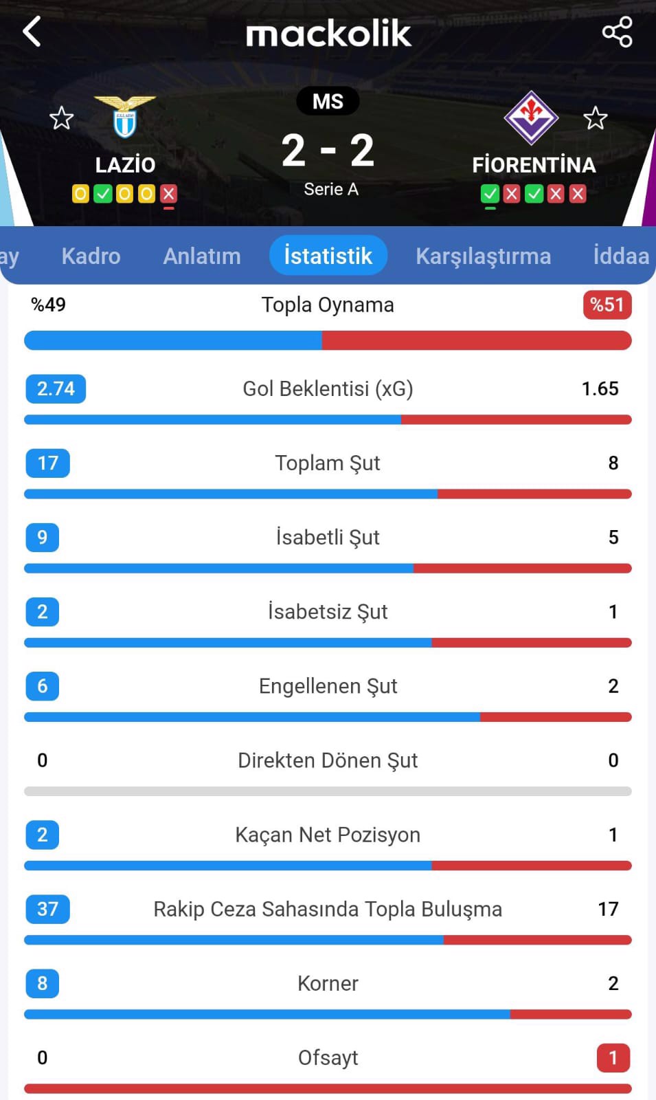 Kalan anlarda başka gol olmayınca karşılaşma 2-2 sona erdi. Bu sonuçla Lazio puanını 25'e yükseltirken, Fiorentina 13 puana ulaştı.